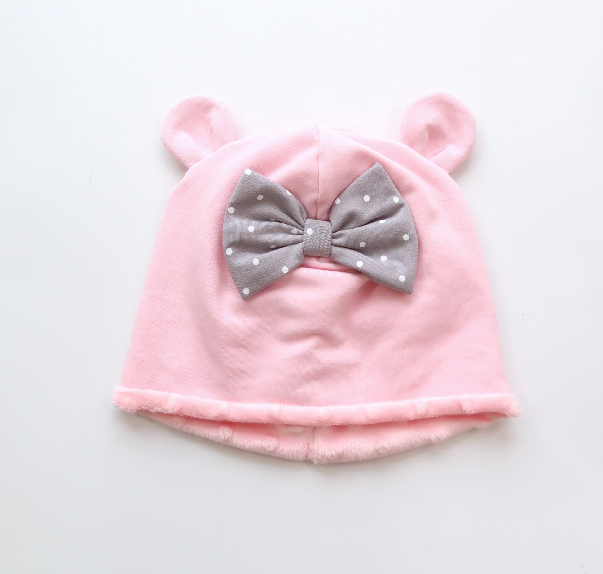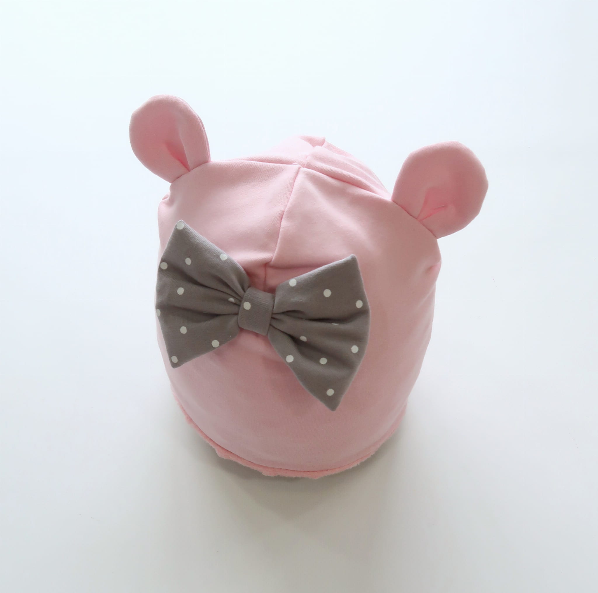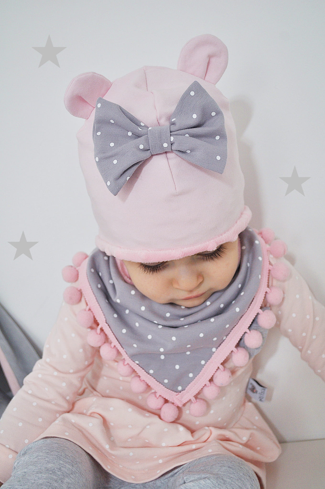 Komplet groszki z uszami i kokardką przy uchu - czapka i chusta