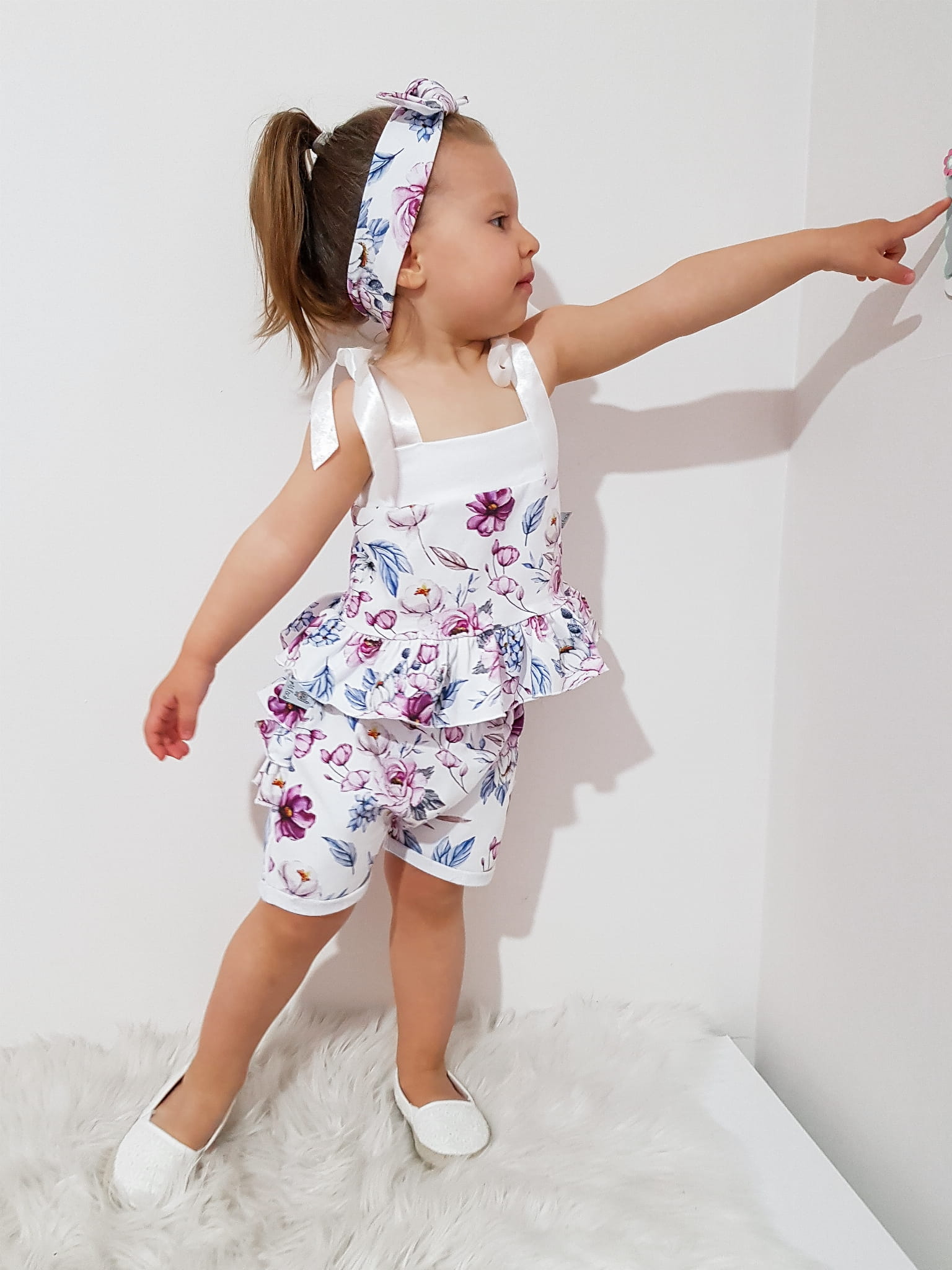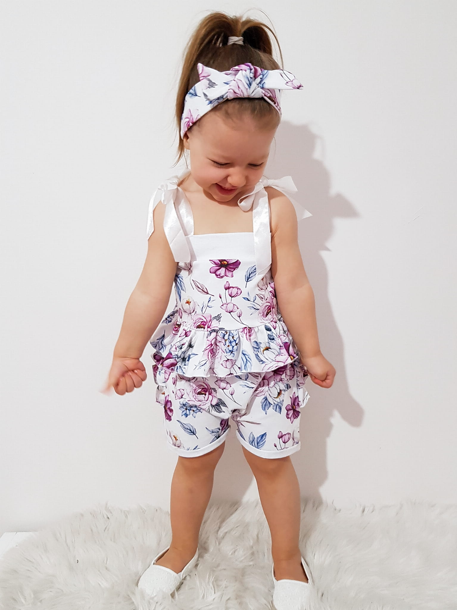Komplet akwarelowe kwiaty - wiązany top, spodenki z falbankami i opaska