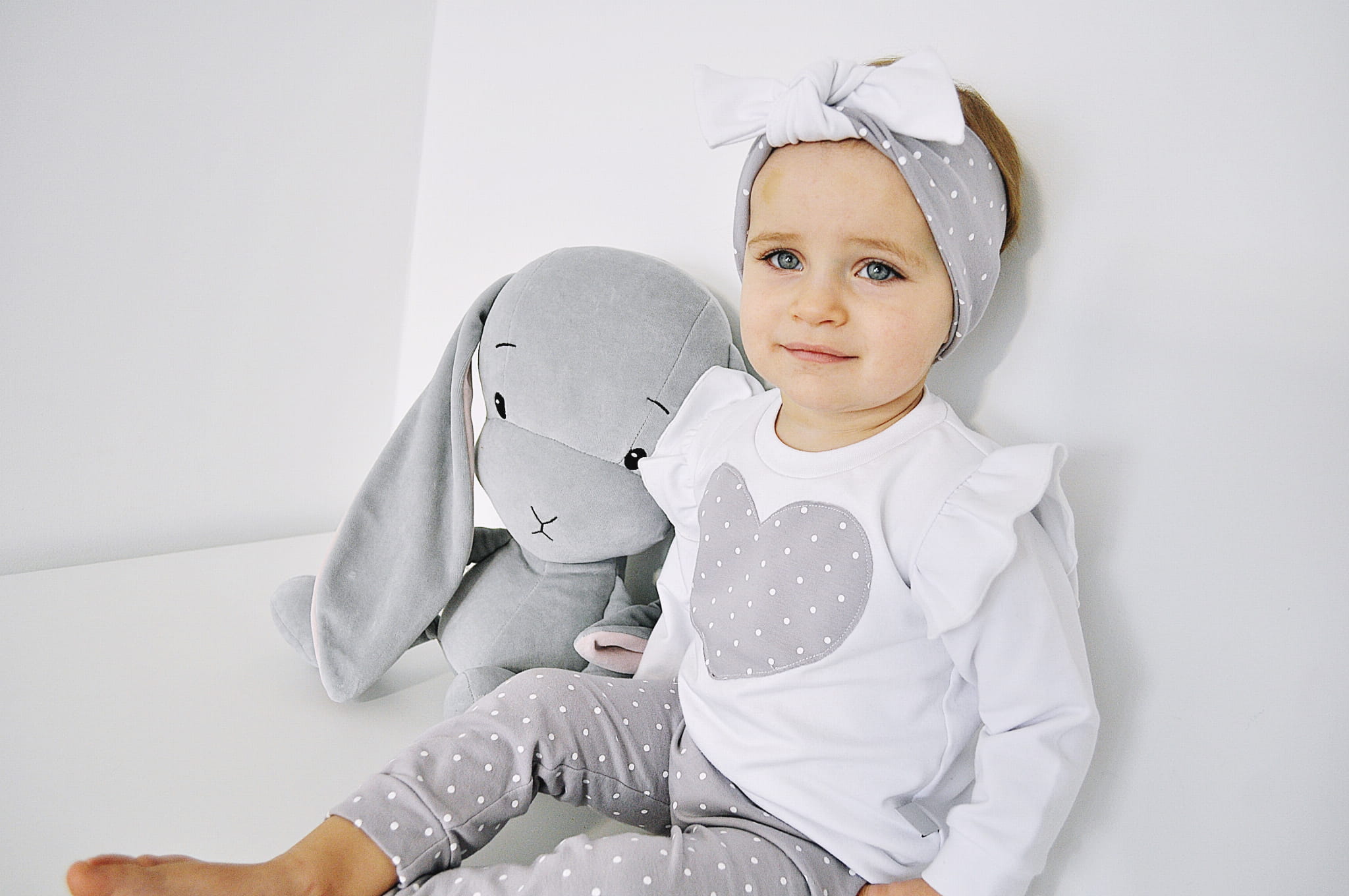 Komplet biel i groszki na szarym - bluza, legginsy i opaska