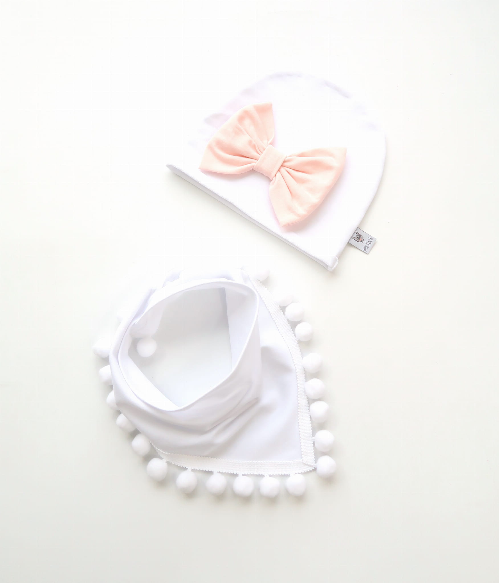 Komplet biel i róż pudrowy z dużą kokardą 2 - czapka i chusta