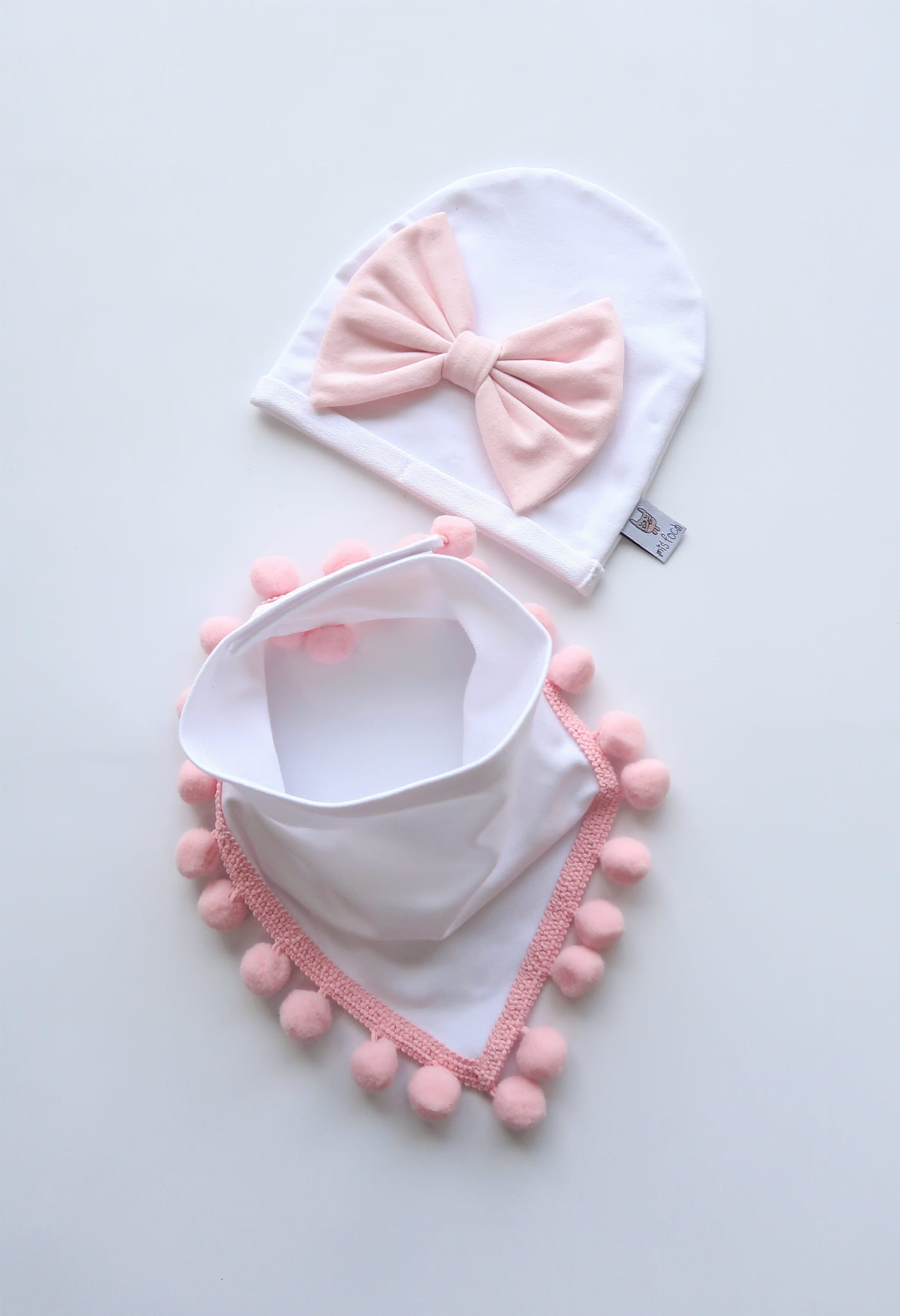 Komplet biel i róż pudrowy z dużą kokardą - czapka i chusta