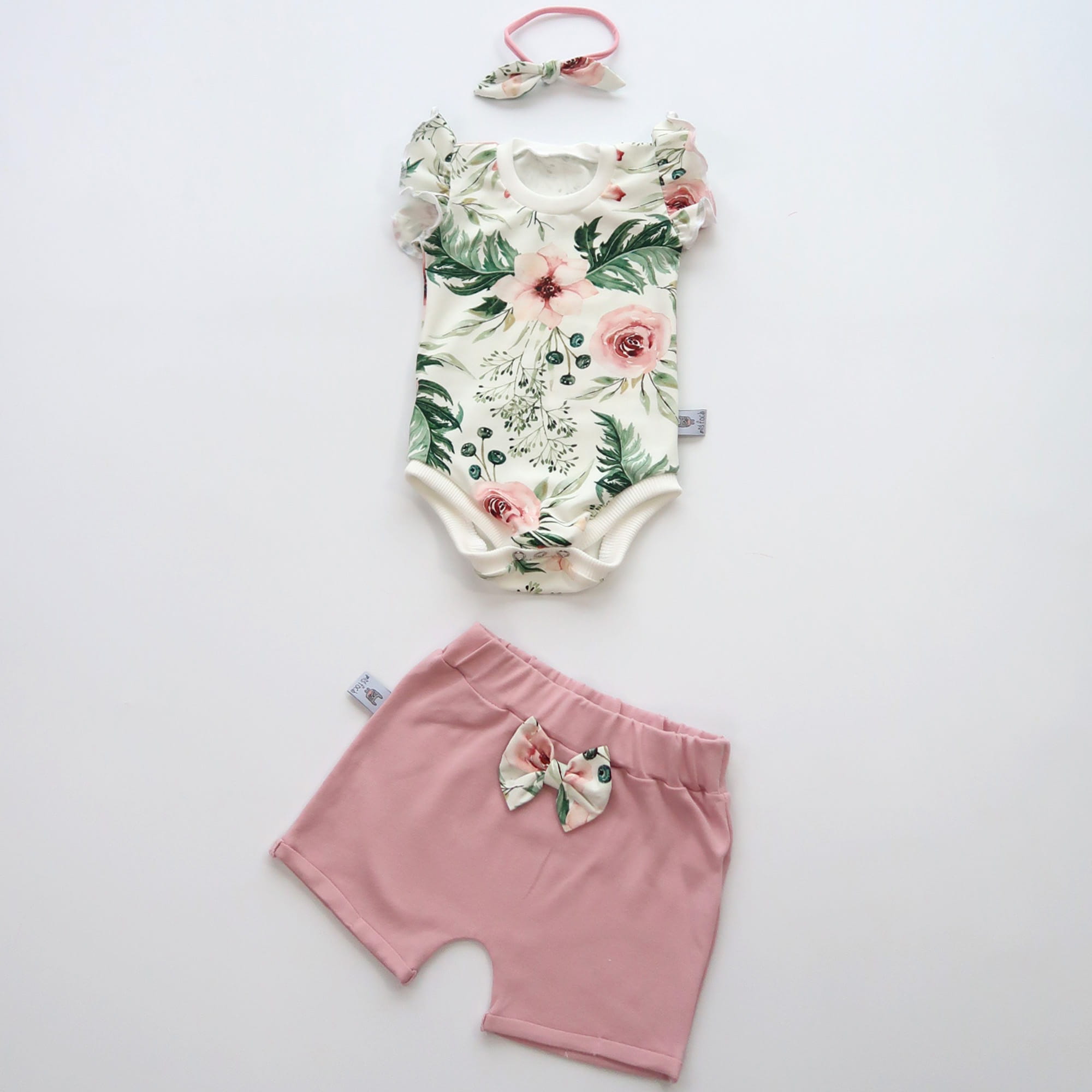 Komplet - body kwiaty w ogrodzie, spodenki i opaska
