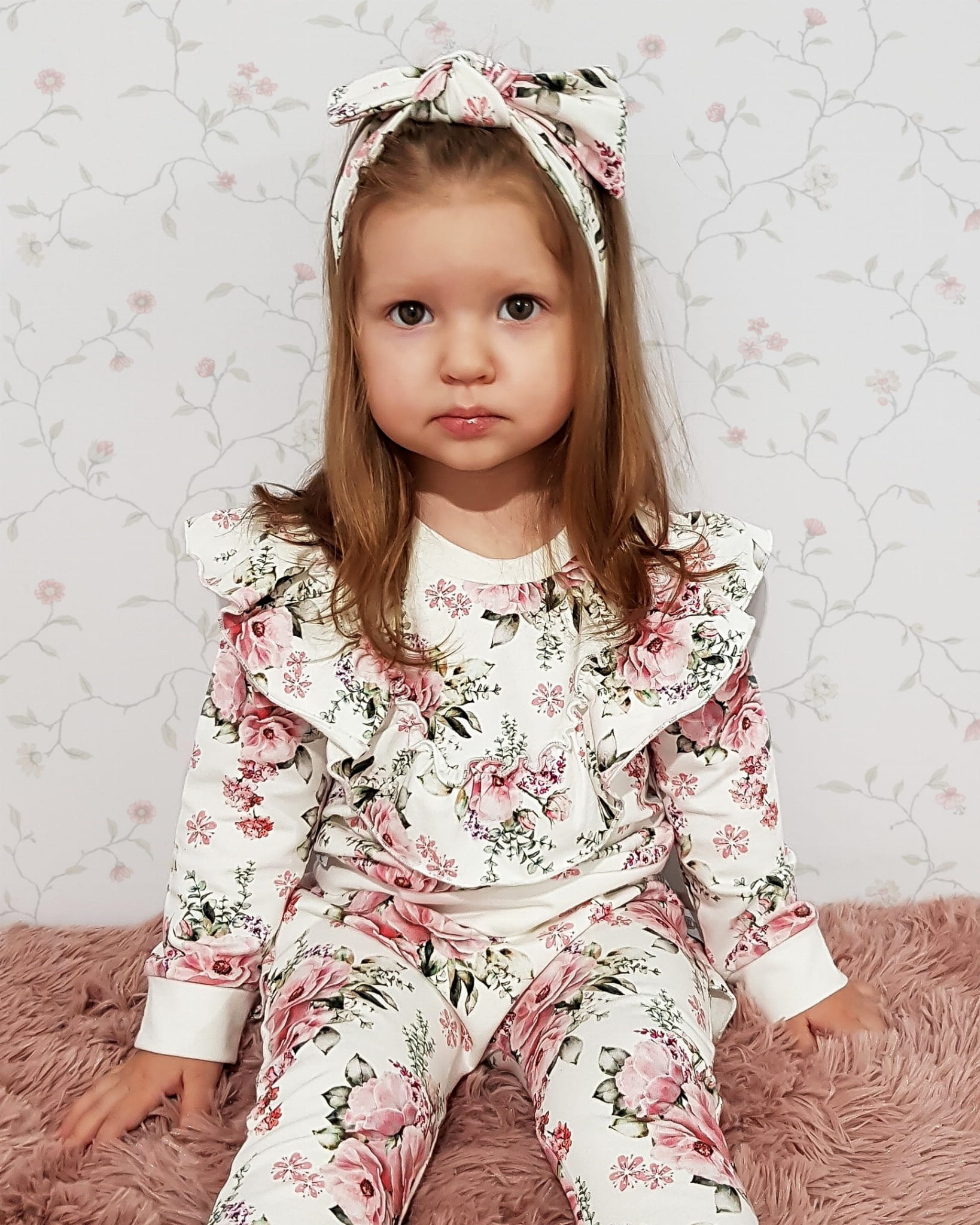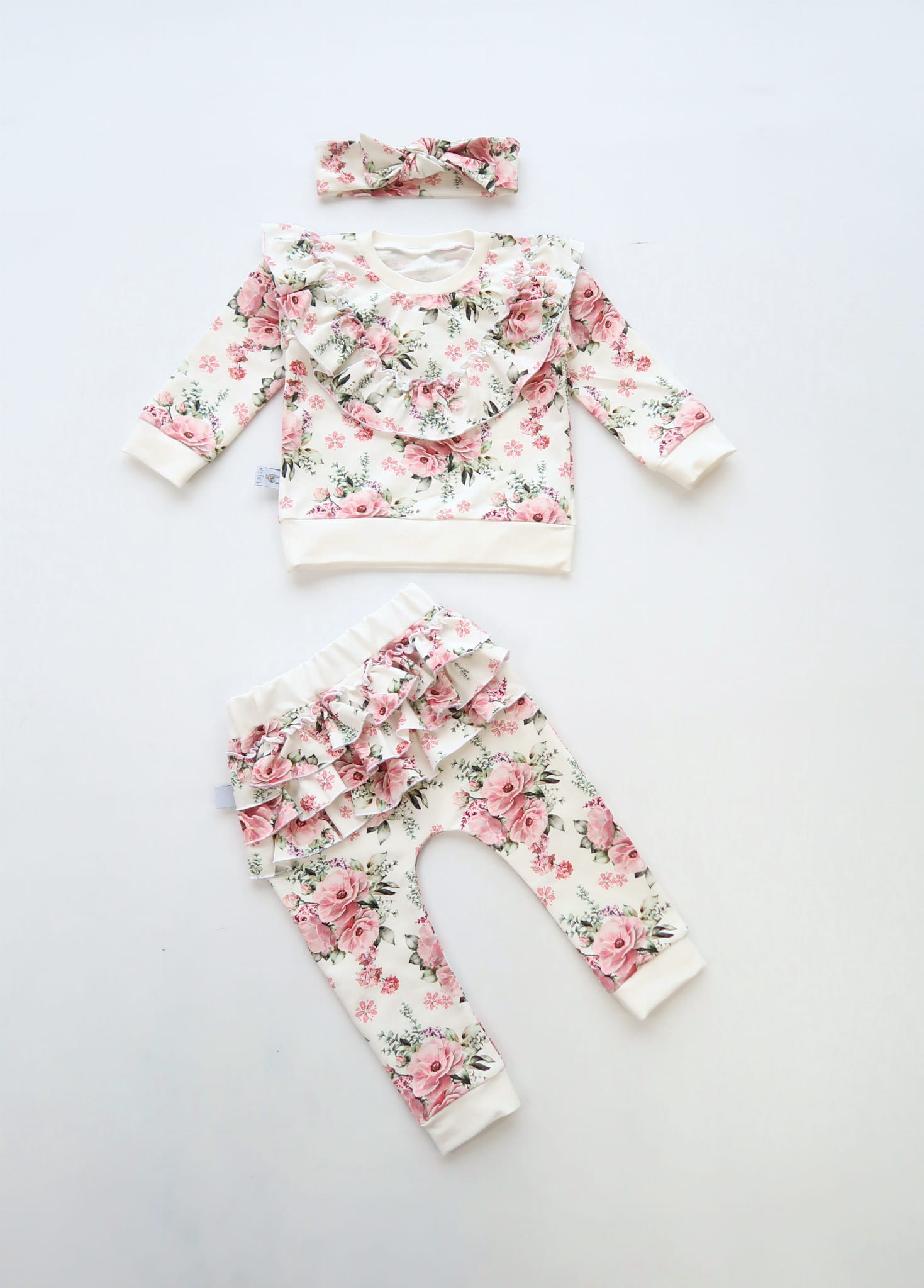 Komplet bukieciki róż z falbankami - bluza, legginsy i opaska
