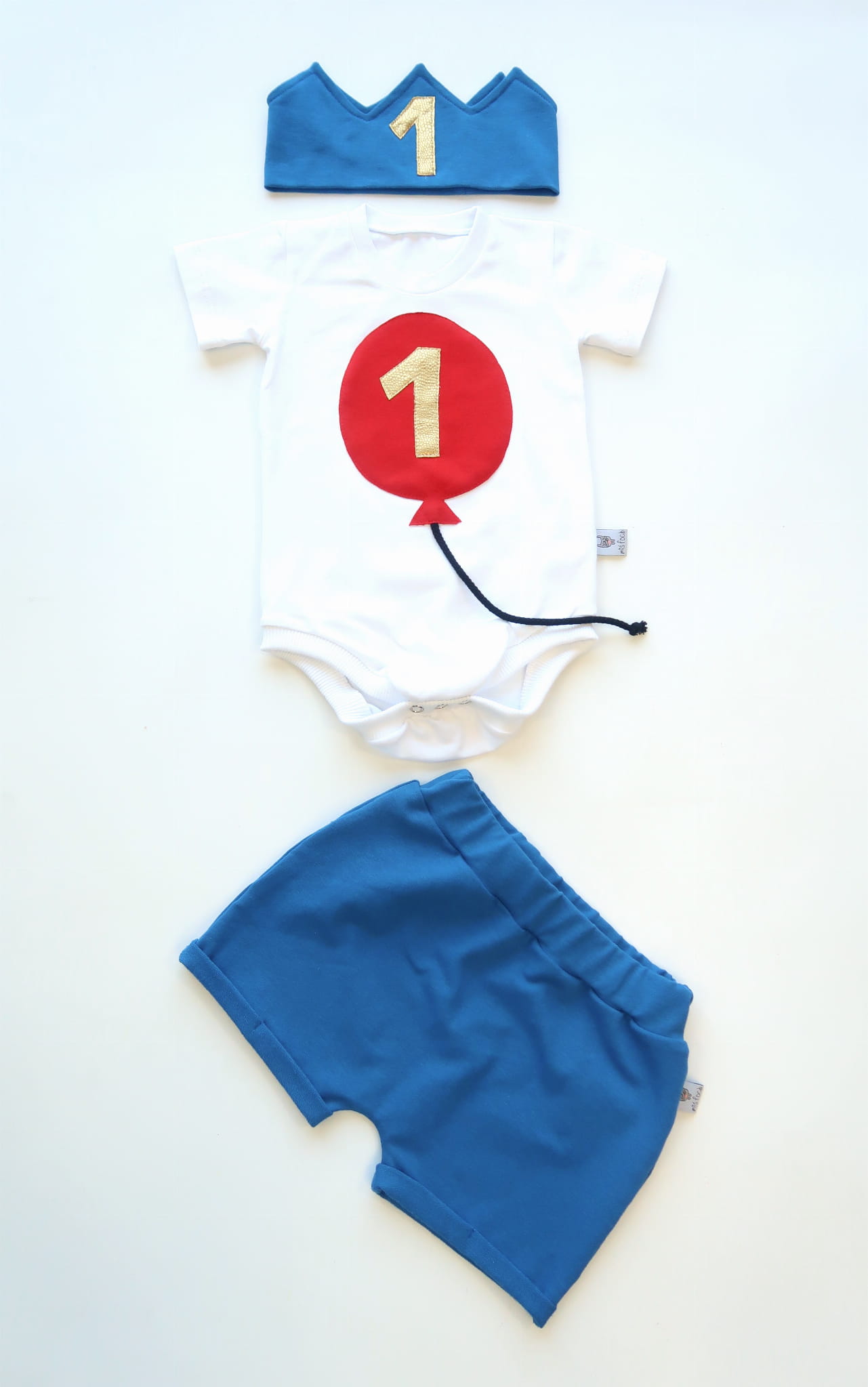 Komplet chaber z balonem na roczek - body, spodenki i opaska korona