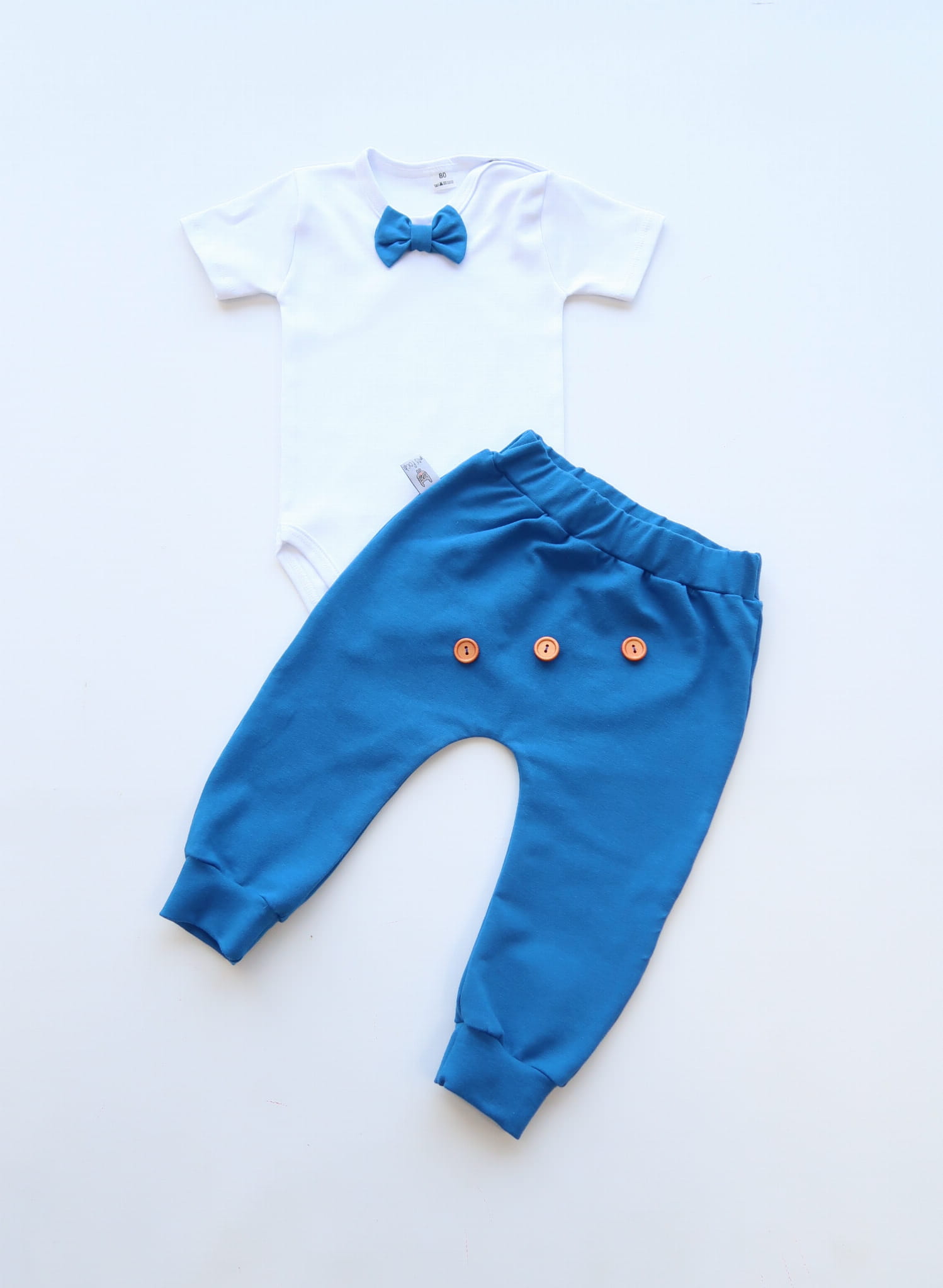 Komplet chaber z guziczkami na roczek - baggy i body z muchą
