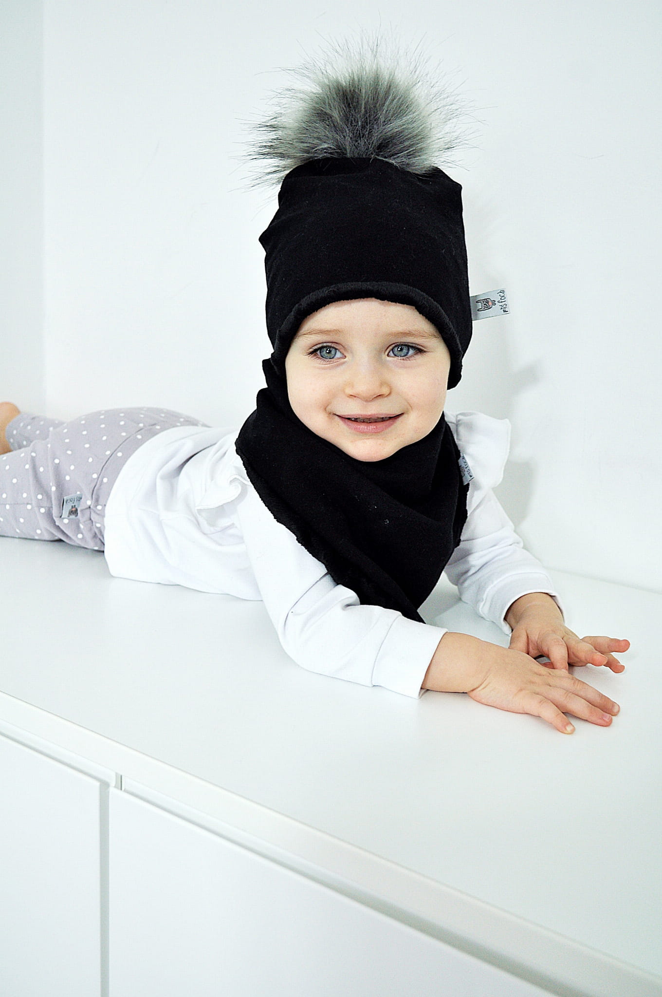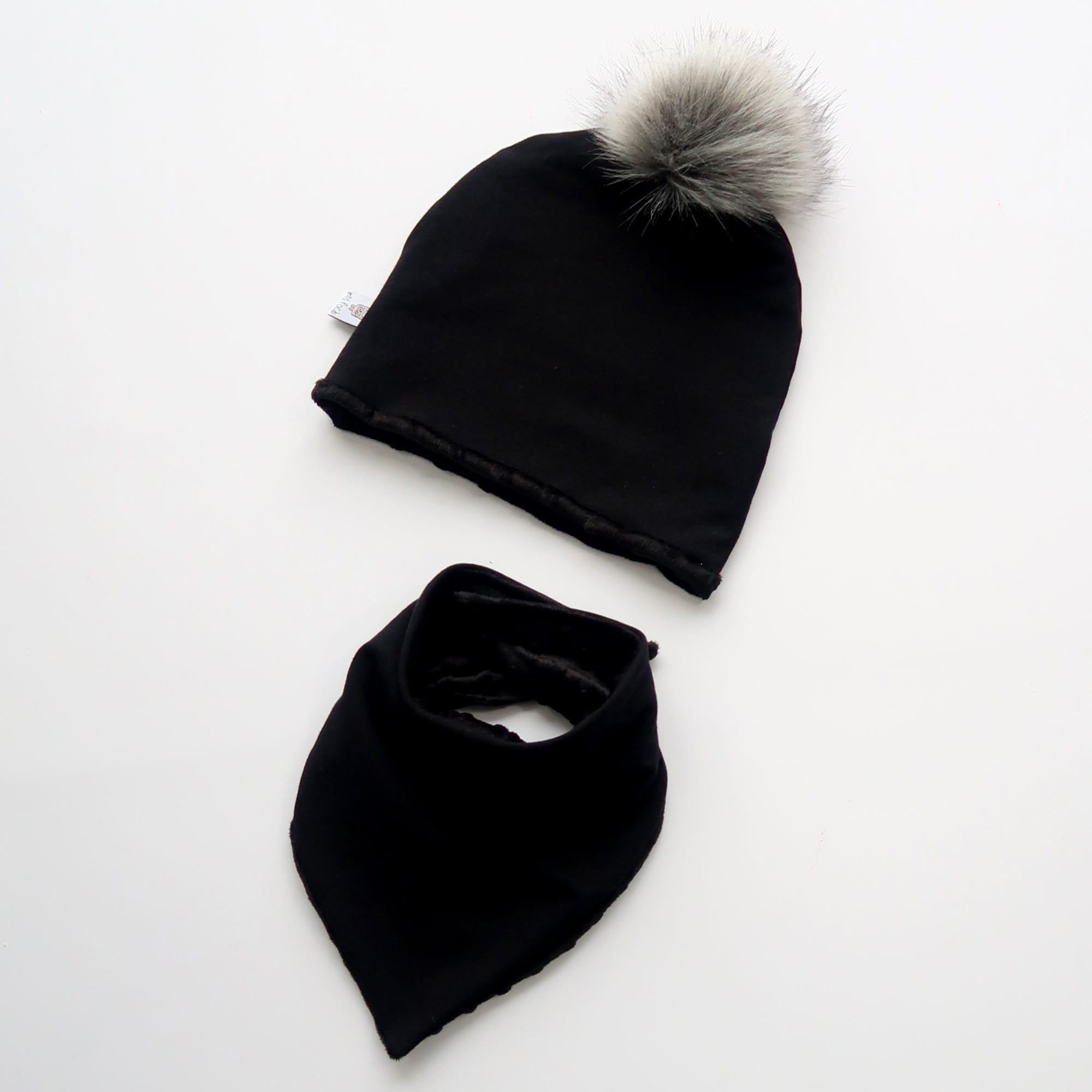 Komplet czerń i pompon srebrny lis - czapka i chusta
