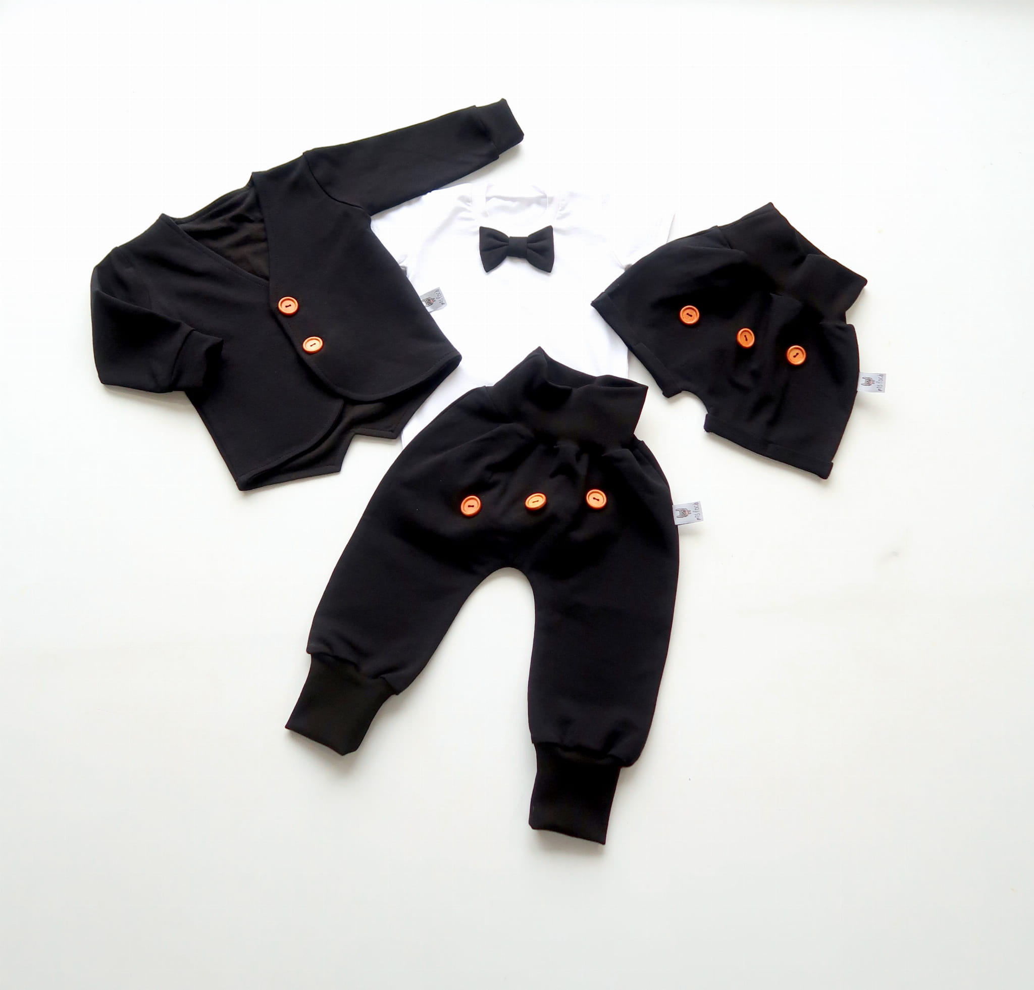 Cudownie miękki, elegancki, ale przede wszystkim wygodny komplecik - frak, baggy i spodenki bezuciskowe, oraz body krotki rękaw z muchą:) Uszyty z dbałością o najmniejszy szczegół, z najwyższej jakości dzianiny. Plecy oraz klapy fraka wykonane są z podwójnego materiału, dzięki czemu układa się on idealnie. Fraki do rozmiaru 68 są zapinane tylko na jeden guzik.