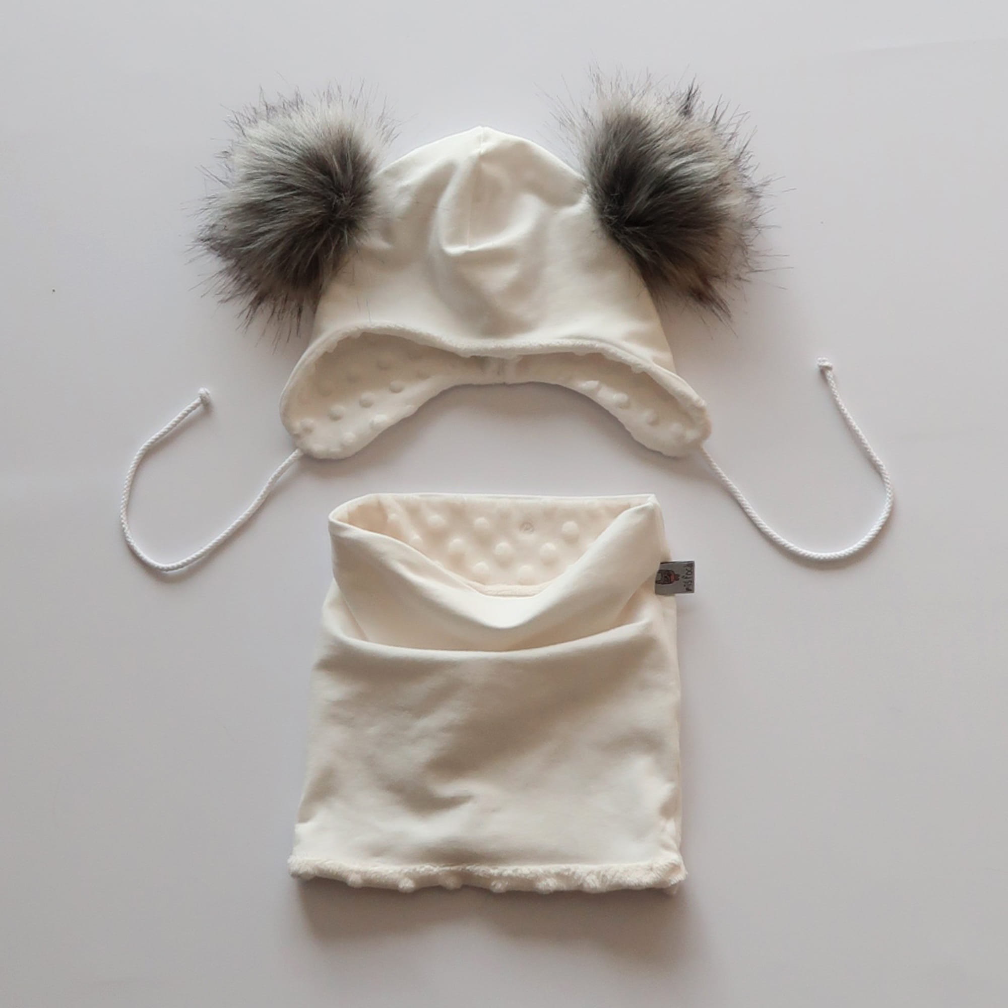 Komplet ecru i pompony srebrny lis - czapka i komin