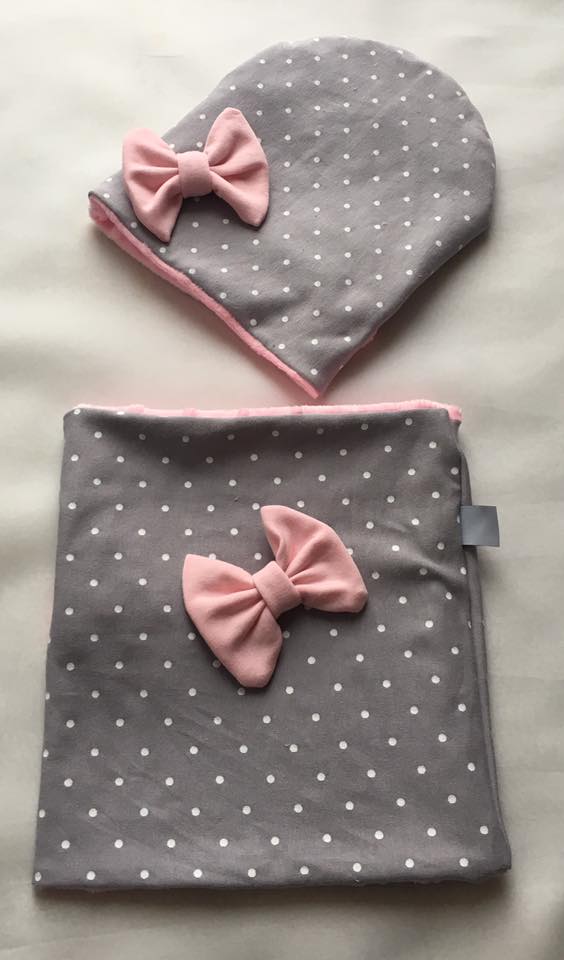 Komplet groszki na szarym z dużą kokardą - czapka i chusta