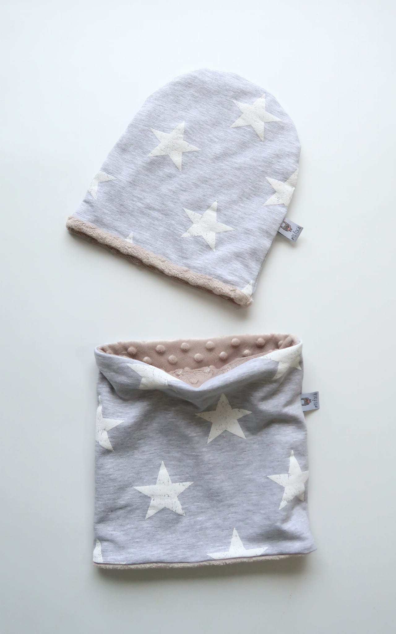 Cudowny, dwuwarstwowy komplet jesienno - zimowy dla Maluszka. Komplet - czapka i komin - wykonany z najwyższej jakości materiałów - ciepły, mięciutki i milutki.