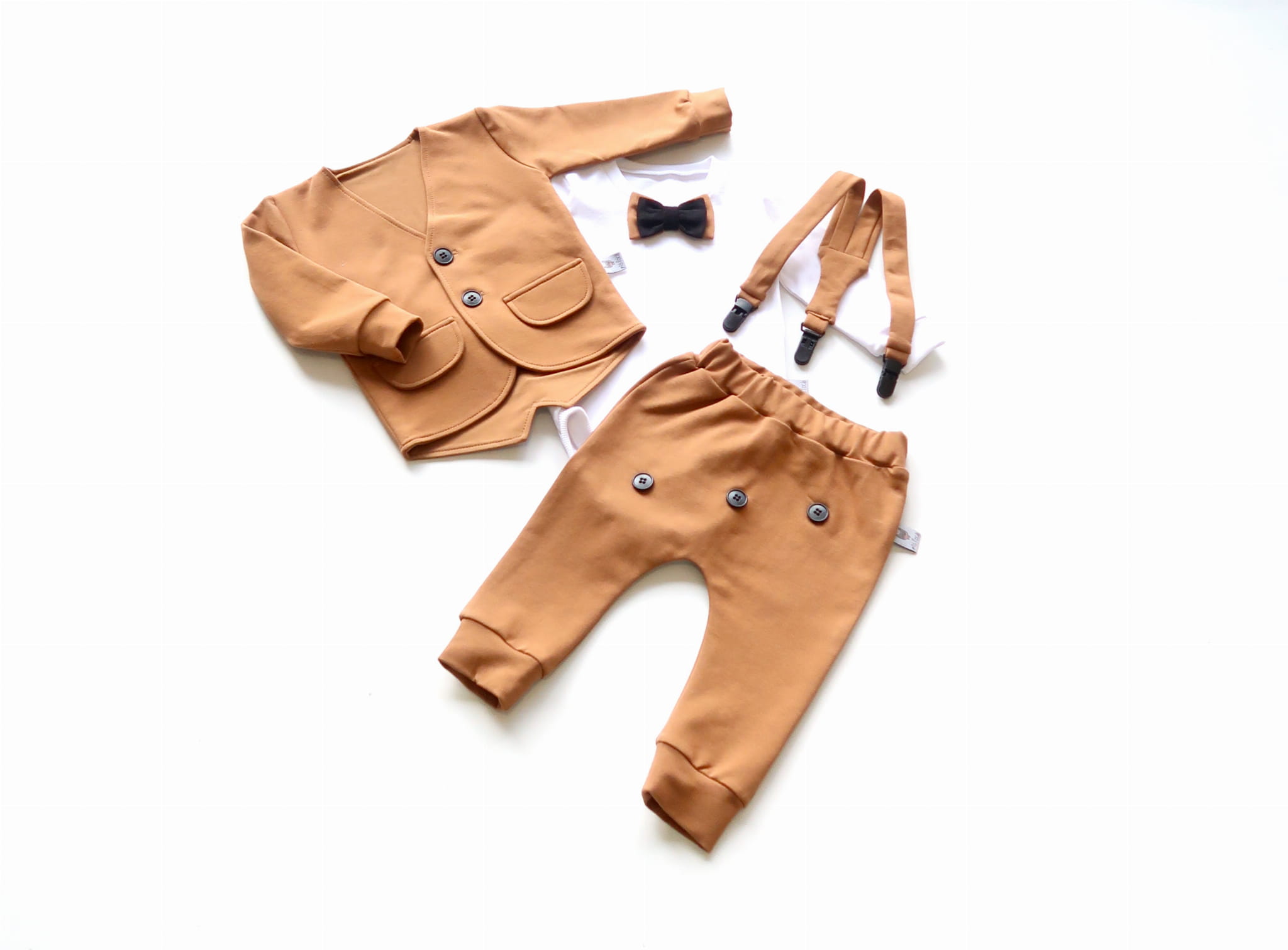 Komplet karmel z guziczkami - frak, body, baggy i szelki