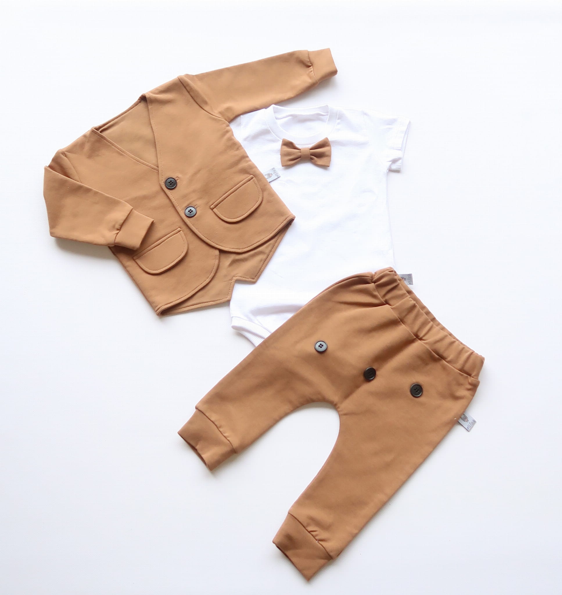 Komplet karmel z guziczkami - frak, body i baggy