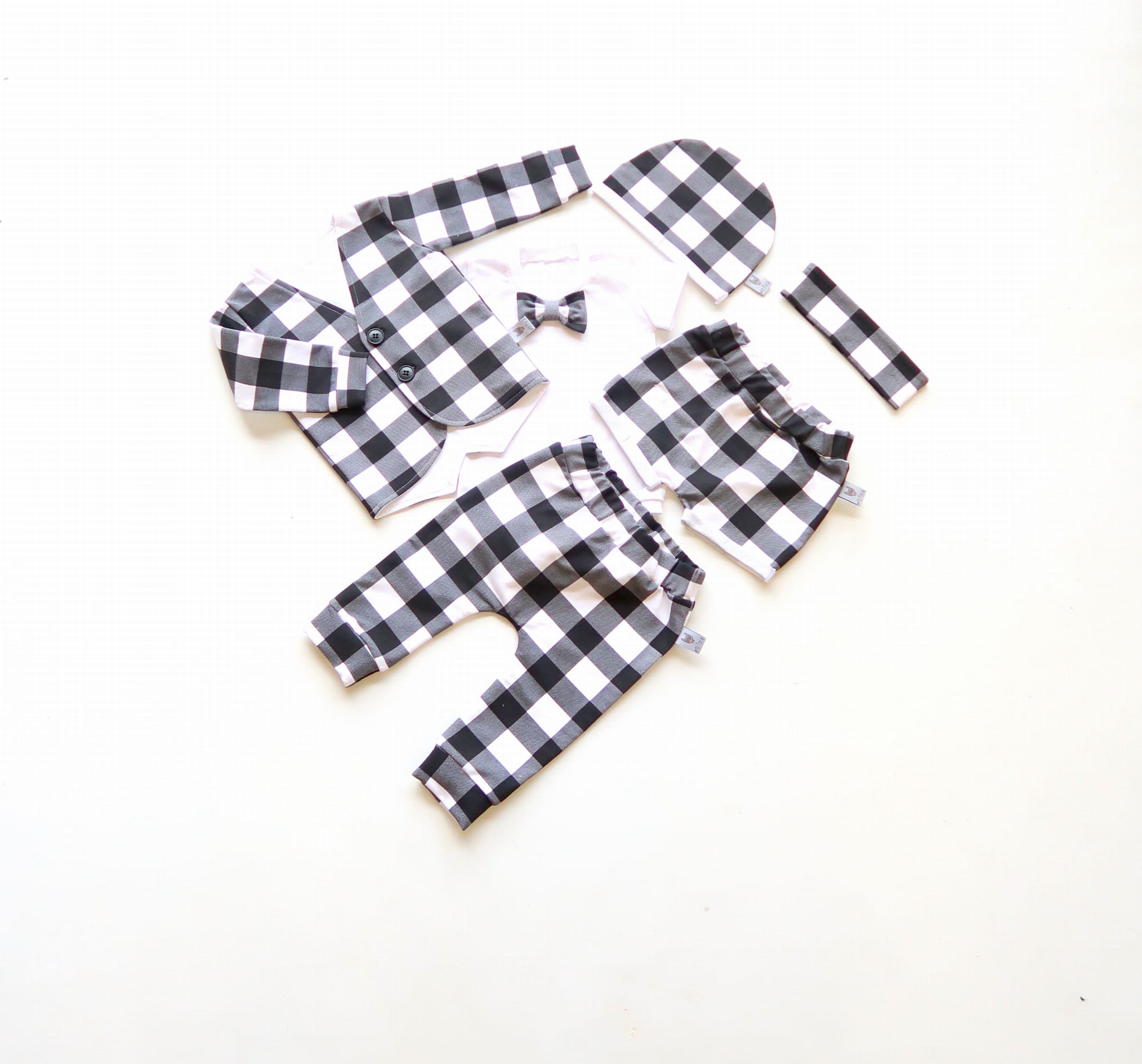 Komplet krata biało - czarna - frak, body, baggy i szorty, czapka oraz opaska