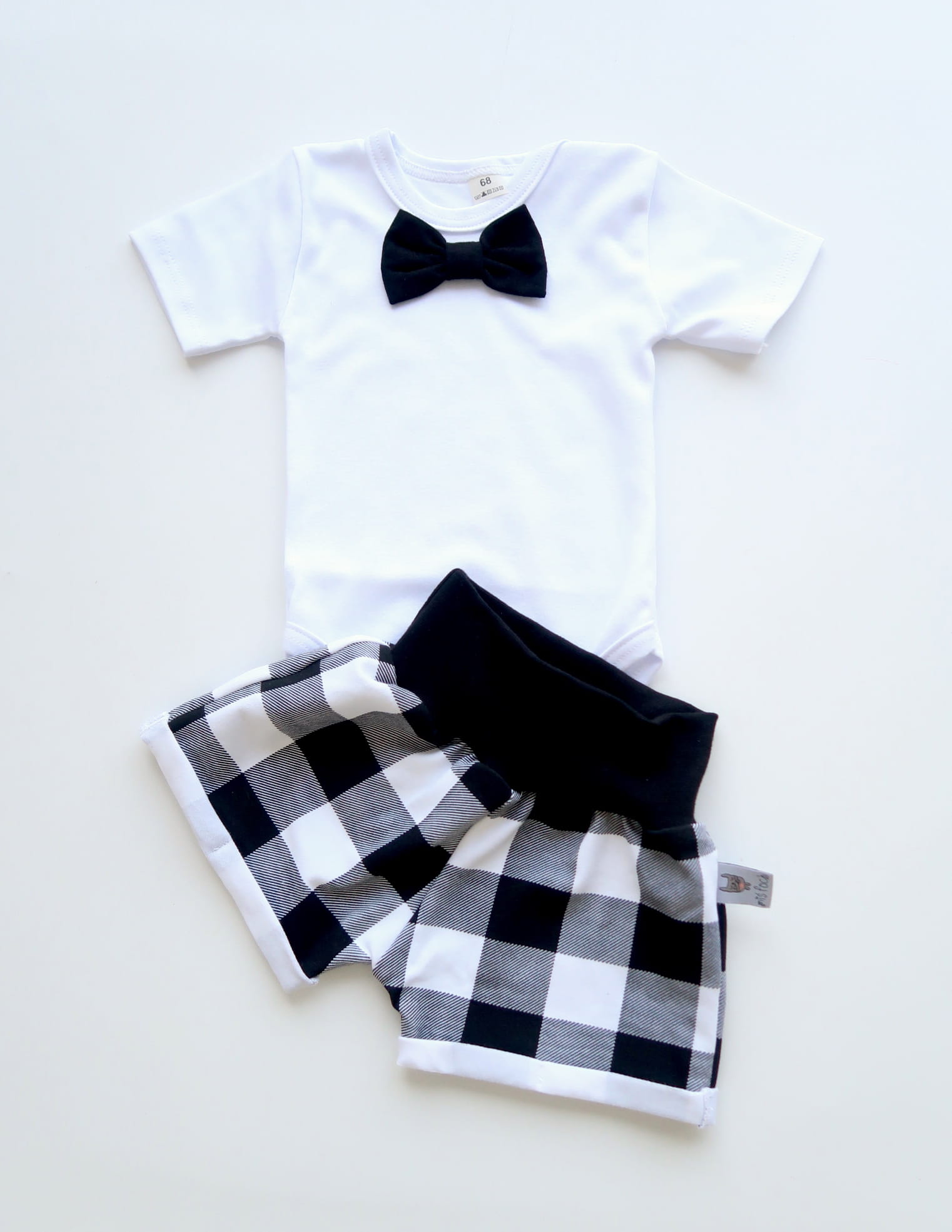 Komplet krata czarna i czarna mucha - body i spodenki bezuciskowe