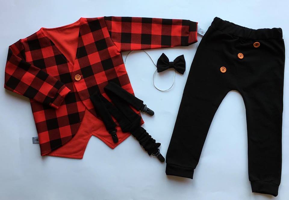Cudownie miękki, elegancki, ale przede wszystkim wygodny komplecik - frak, baggy, muchąa oraz szelki:) Uszyty z dbałością o najmniejszy szczegół, z najwyższej jakości dresówki. Plecy oraz klapy fraka wykonane są z podwójnego materiału, dzięki czemu układa się on idealnie.