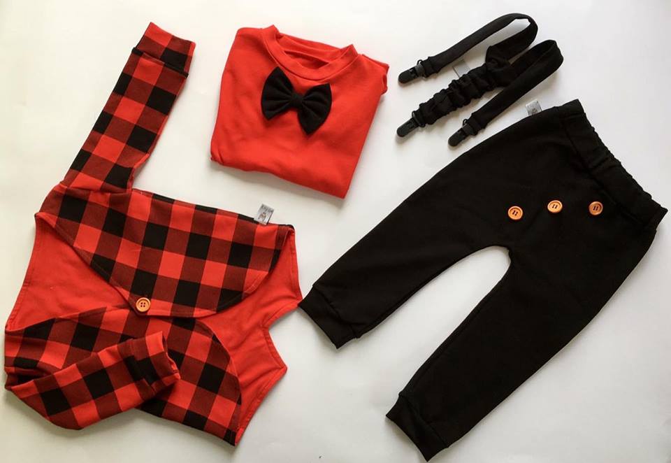 Komplet krata czerwona i czerń - baggy, body z muchą oraz szelki