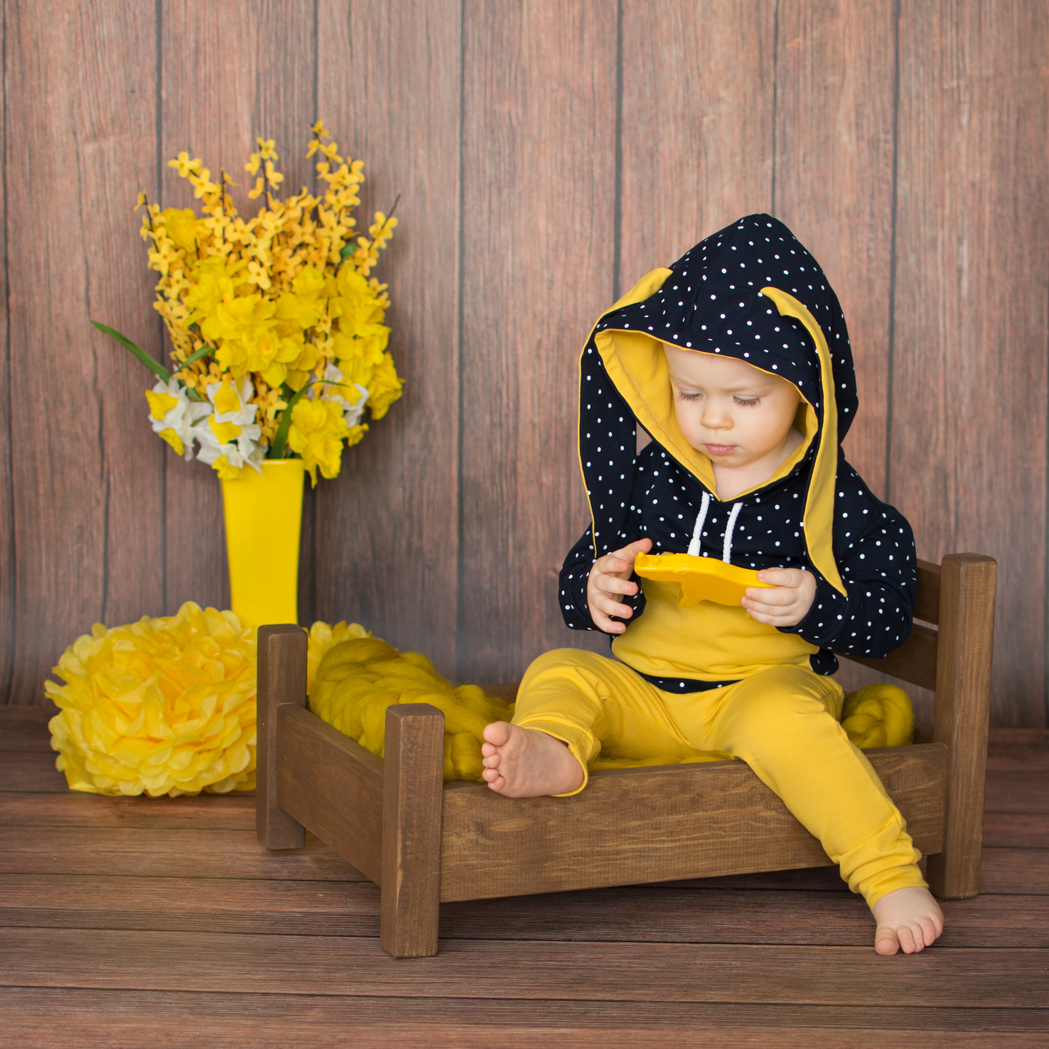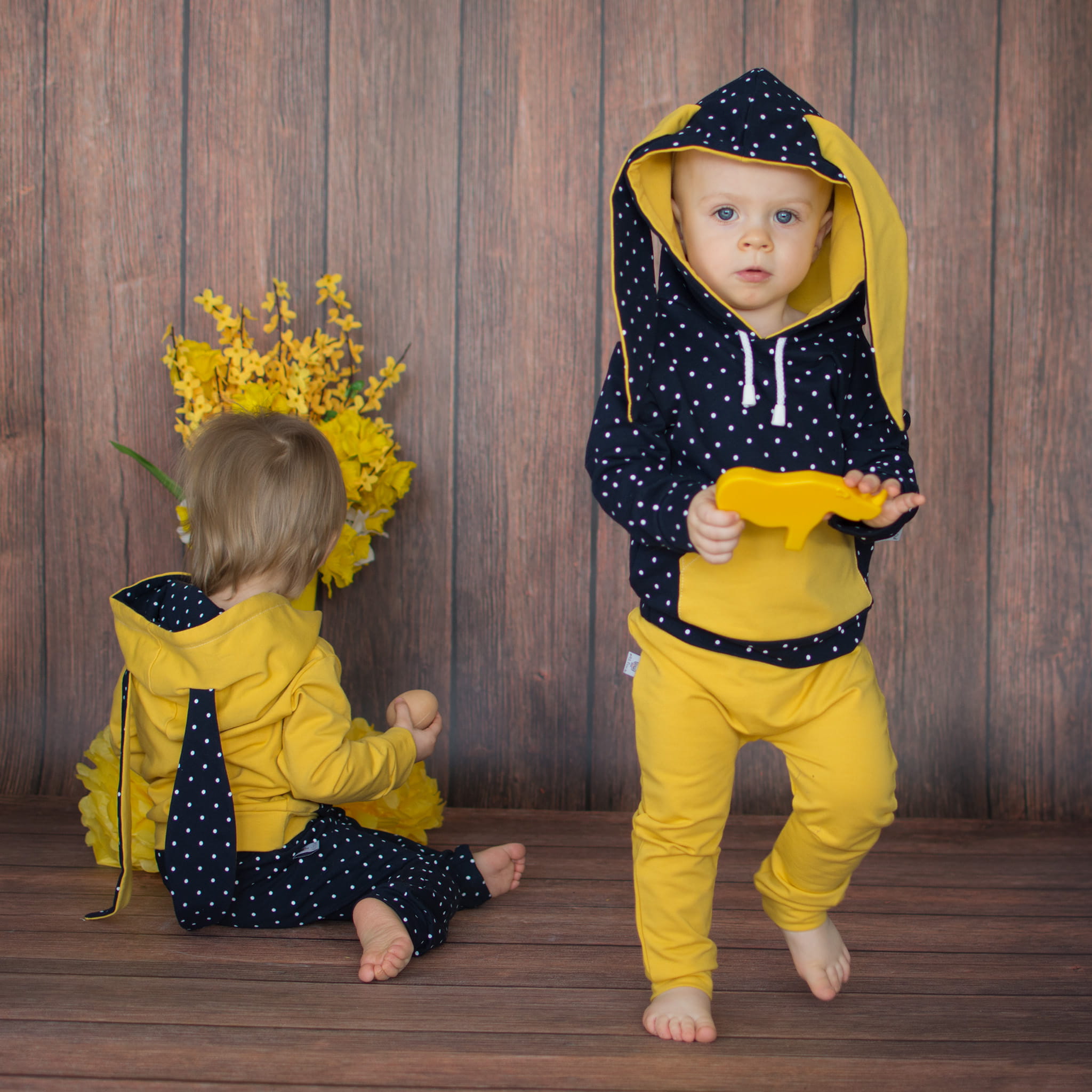 Komplet króliczek - granat w groszki i musztarda - bluza i baggy
