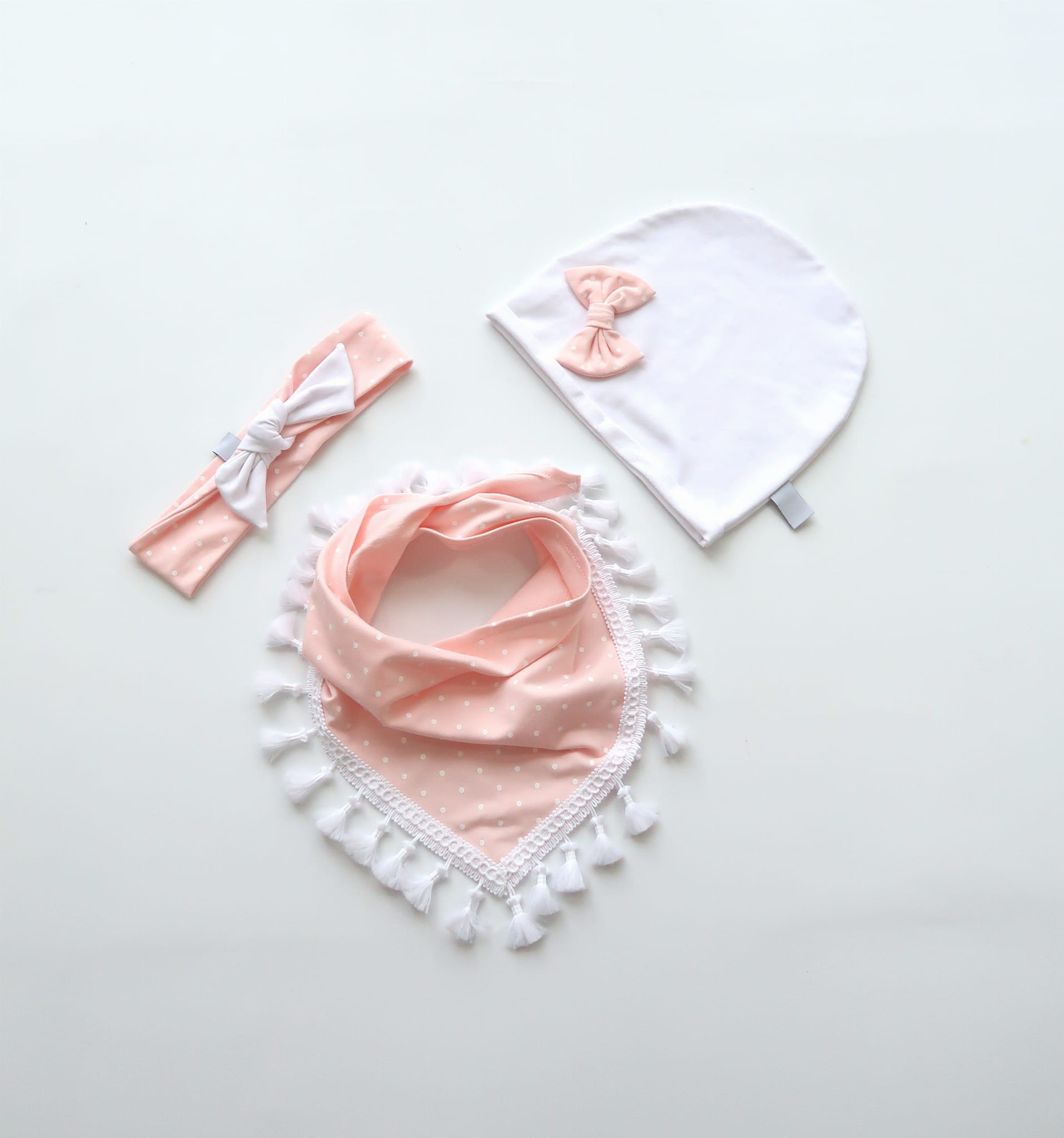 Komplet kropeczki i biel - czapka, chusta i opaska