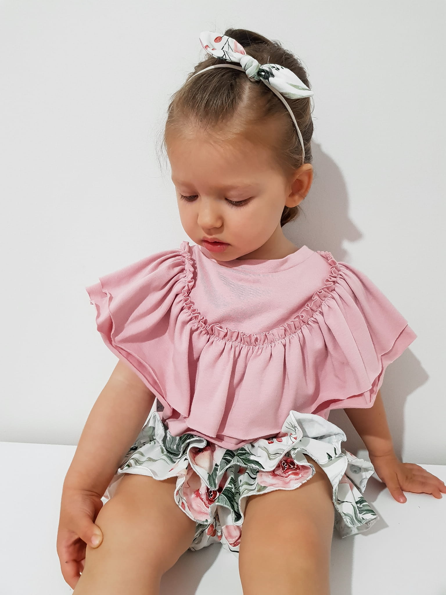 Komplet kwiaty w ogrodzie i kwarc - koszulka, bloomersy z falbankami i opaska bezuciskowa