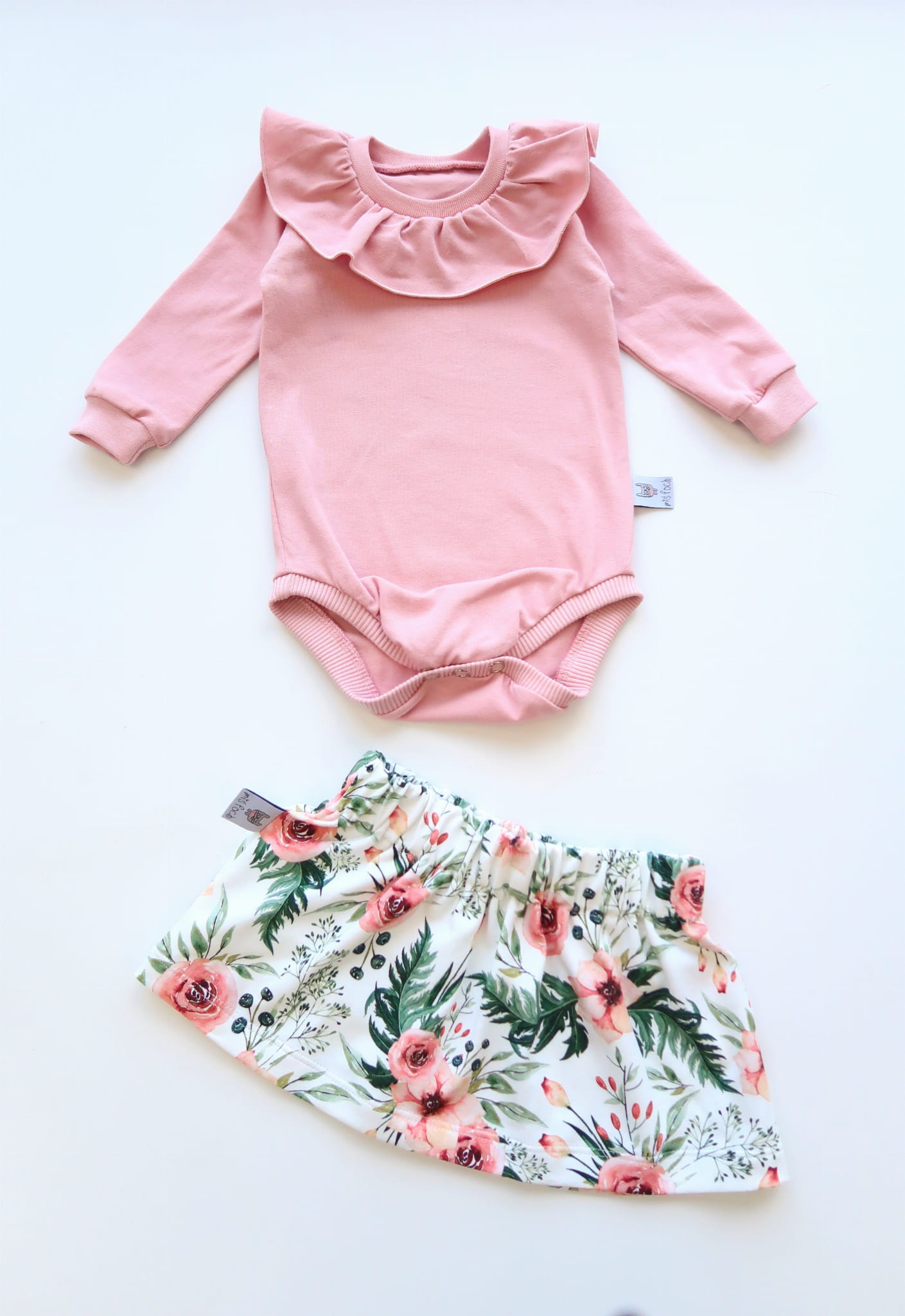 Komplet kwiaty w ogrodzie i róż kwarcowy - body i spódniczka