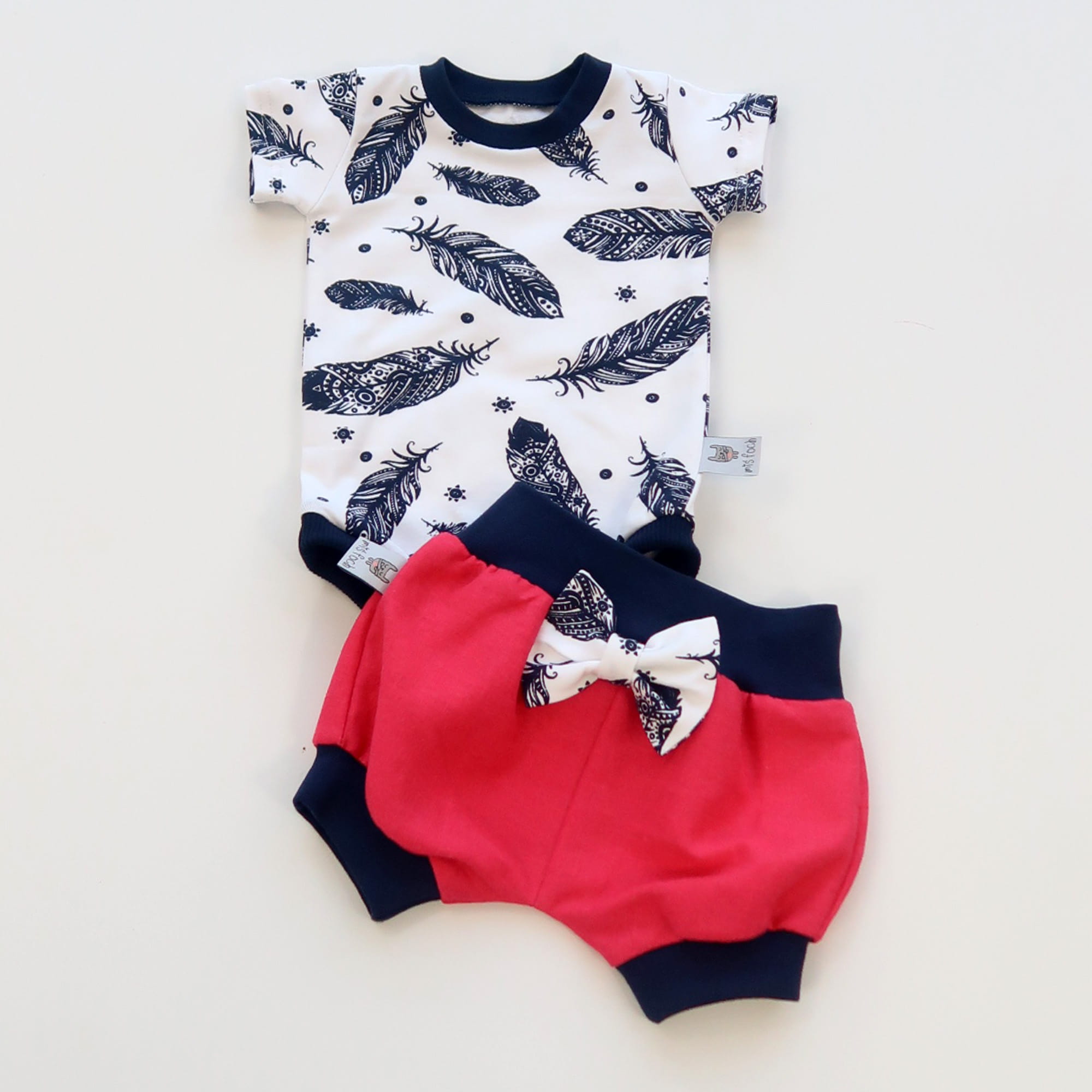Komplet len i piórka granat - body i spodenki bezuciskowe