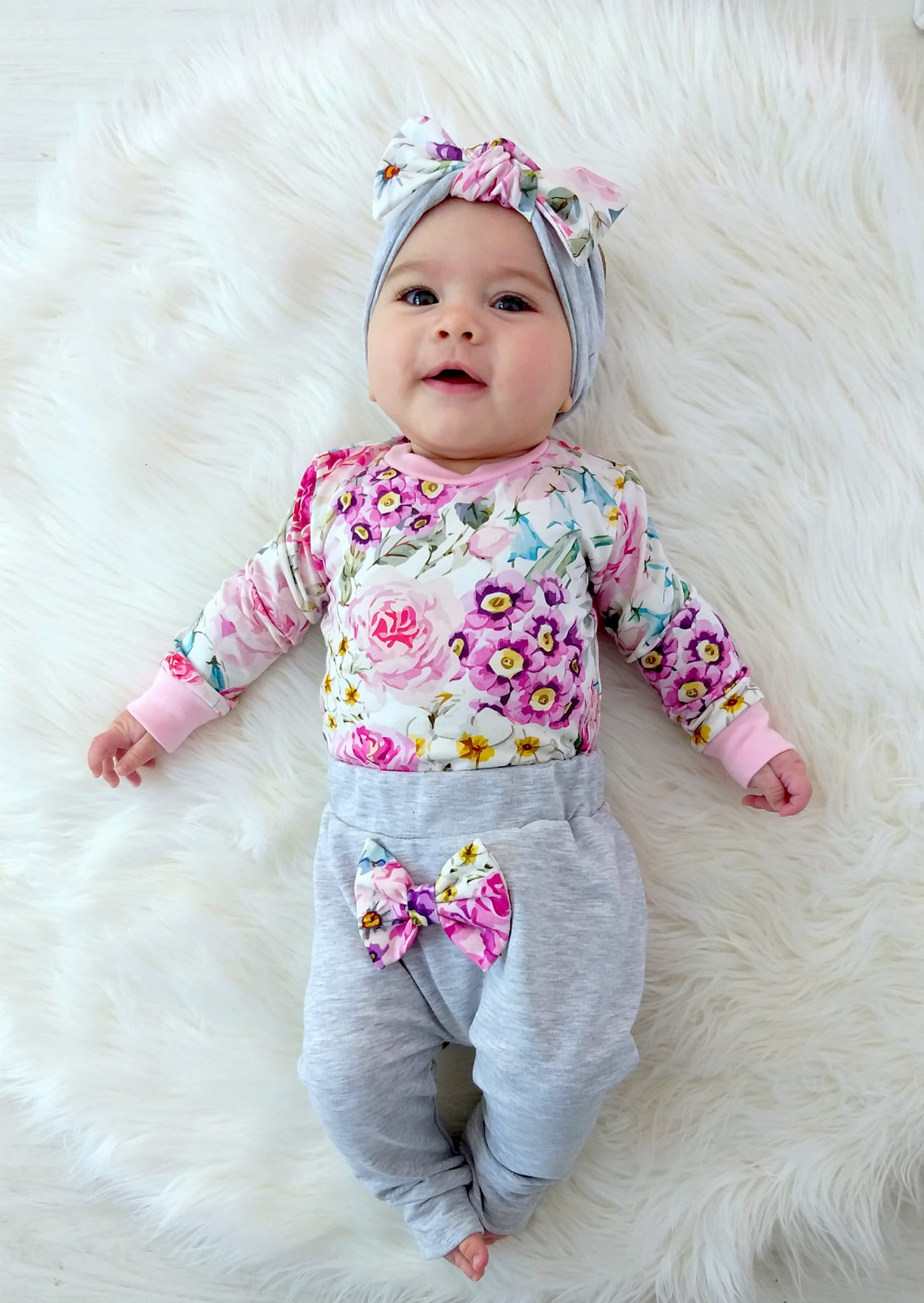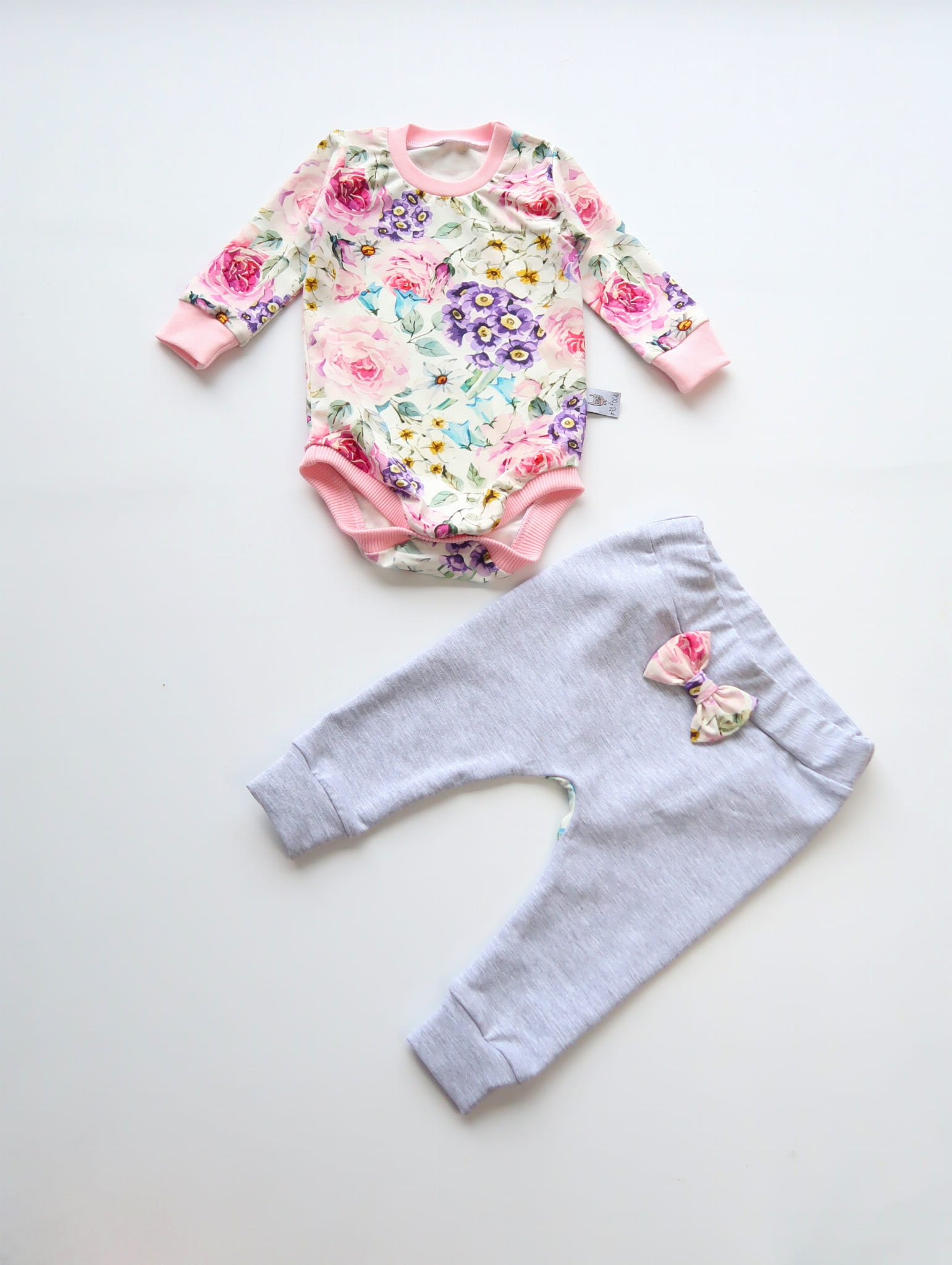 Komplet letnie kwiaty i szarości - body+legginsy