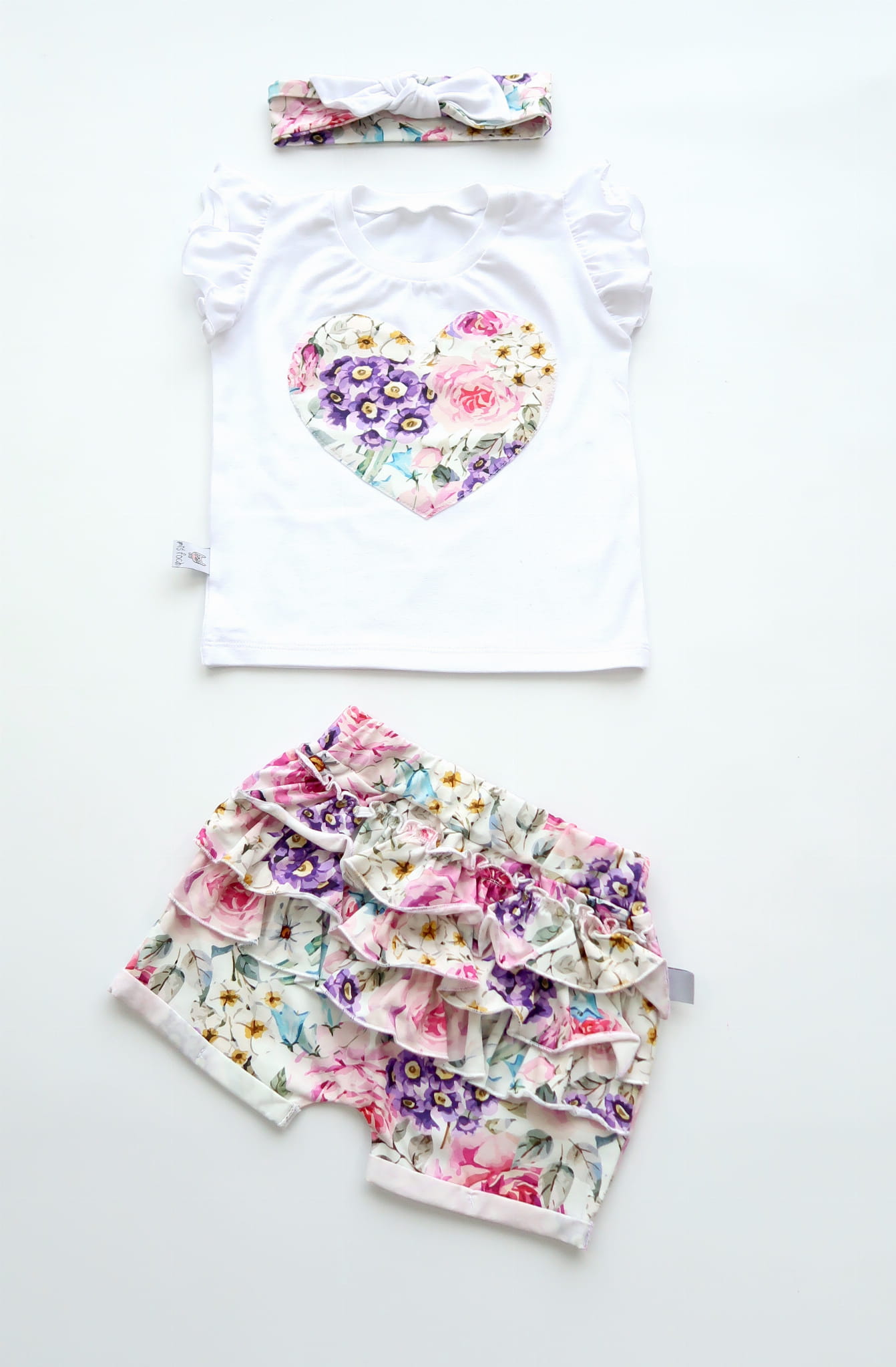 Komplet letnie kwiaty - koszulka, spodenki z falbankami i opaska
