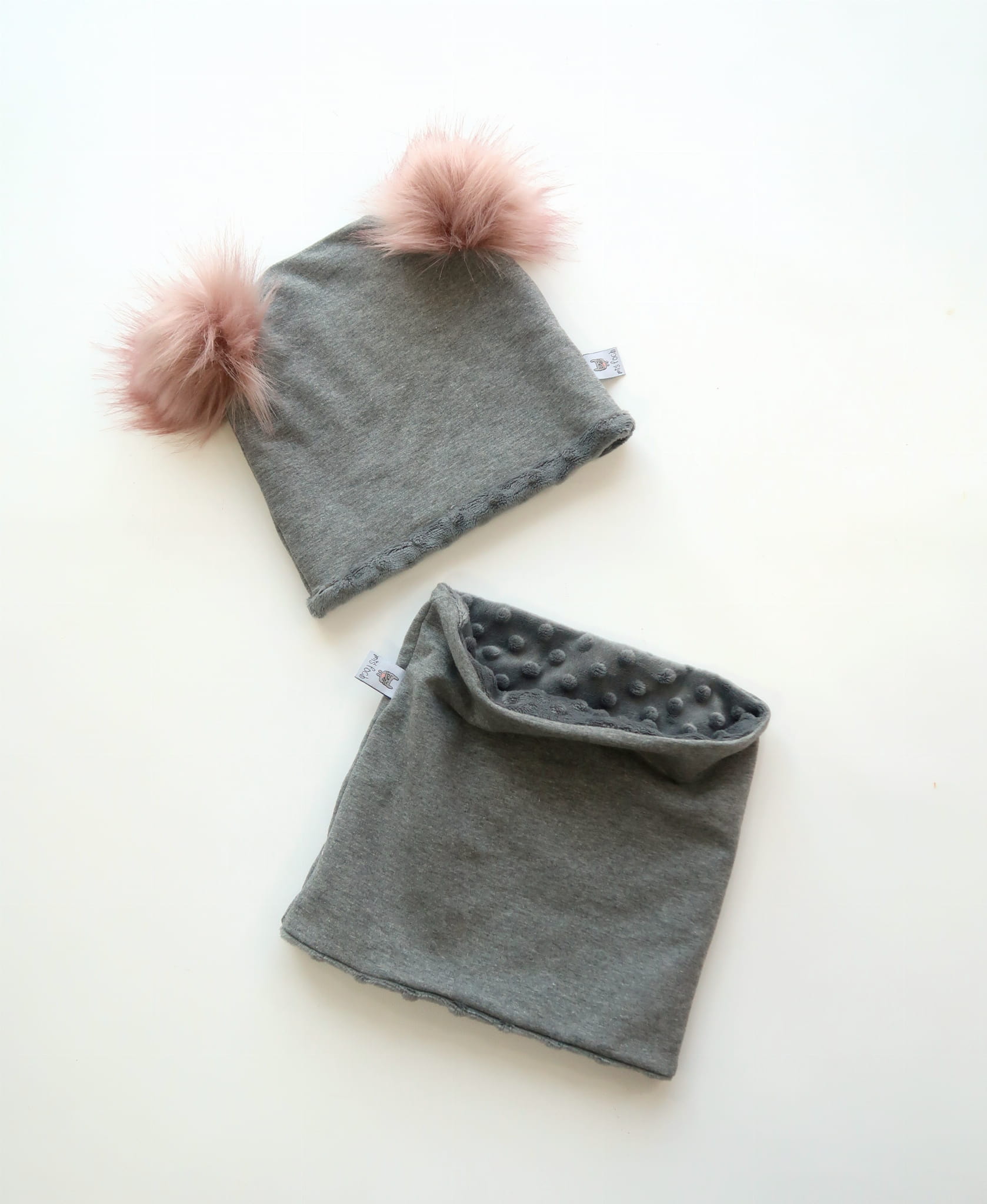 Cudowny, dwuwarstwowy komplet jesienno - zimowy. Komplet - czapka i komin - wykonany z najwyższej jakości materiałów - ciepły, mięciutki i milutki.