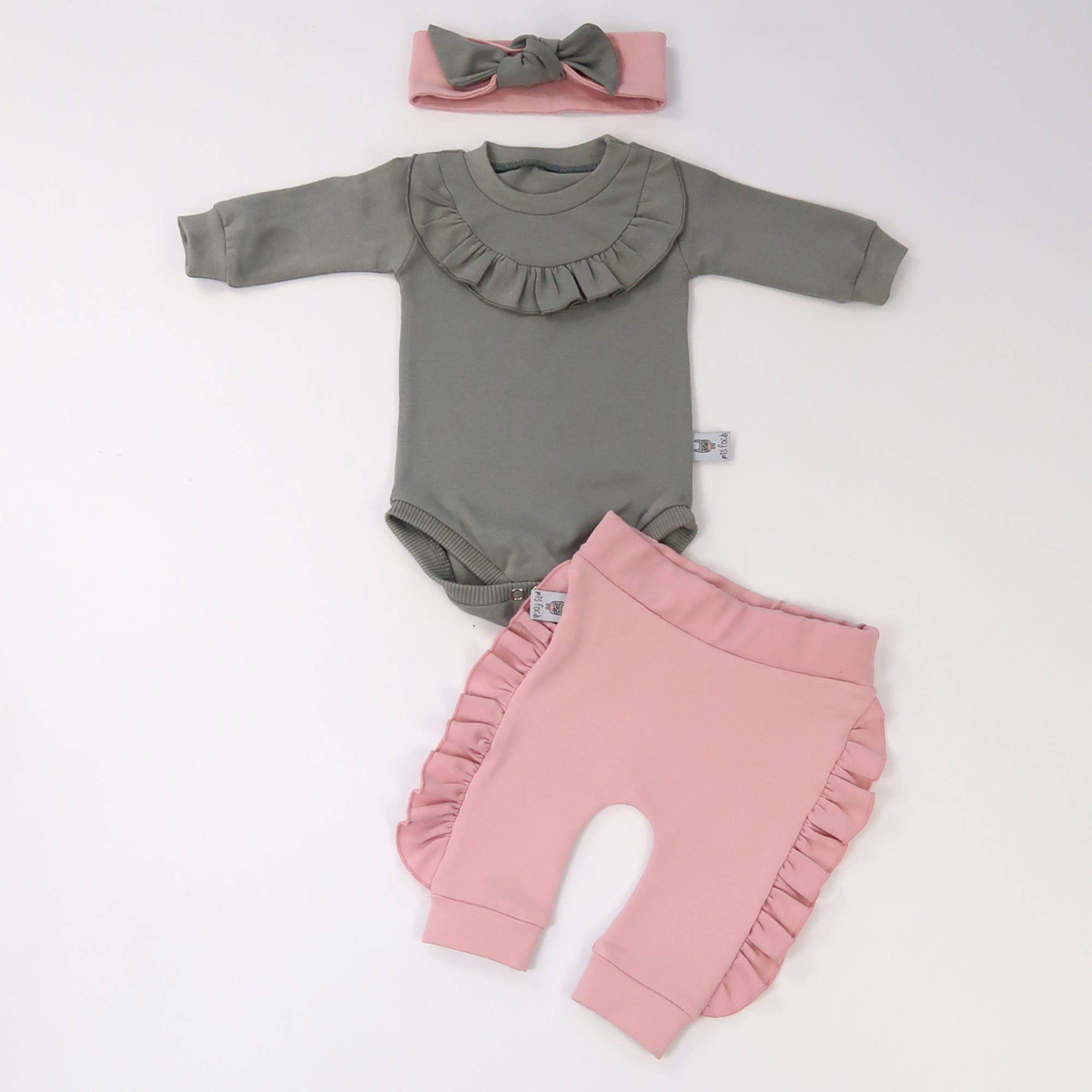 Komplet melanż i róż kwarcowy z falbankami - body, legginsy i opaska