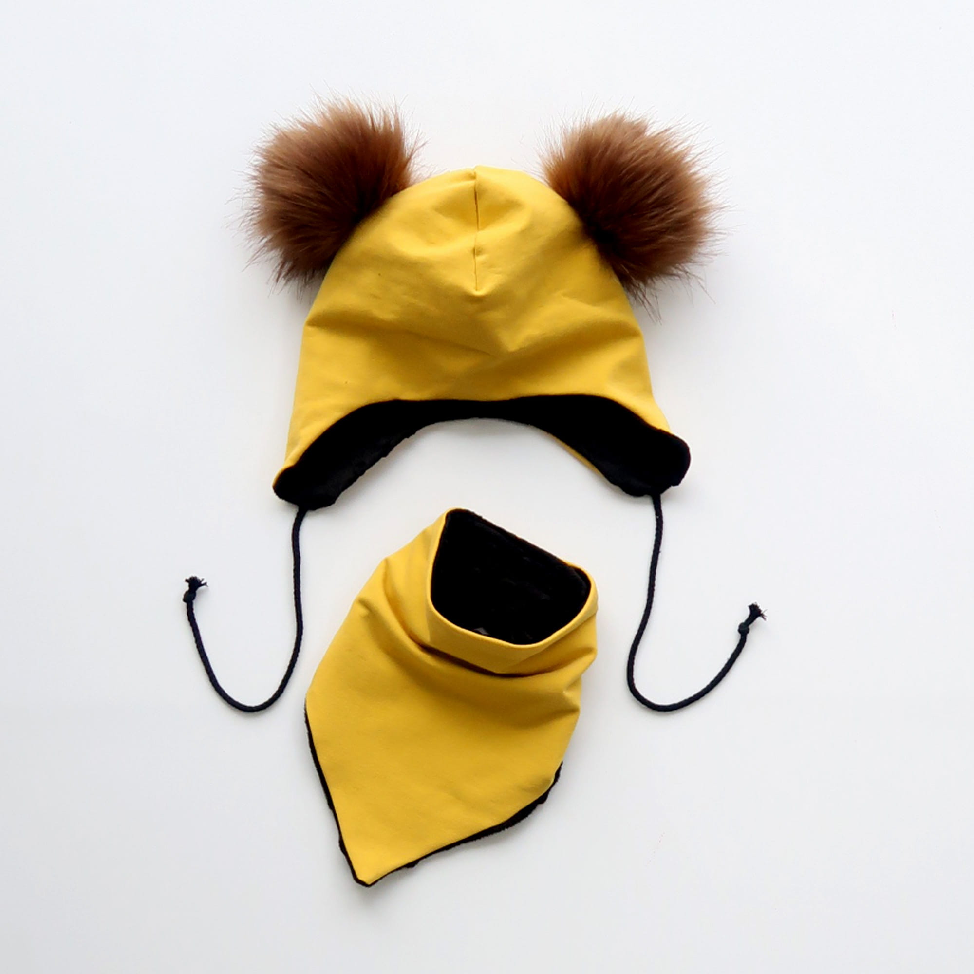 Komplet musztarda i brązowe pompony - czapka i chusta