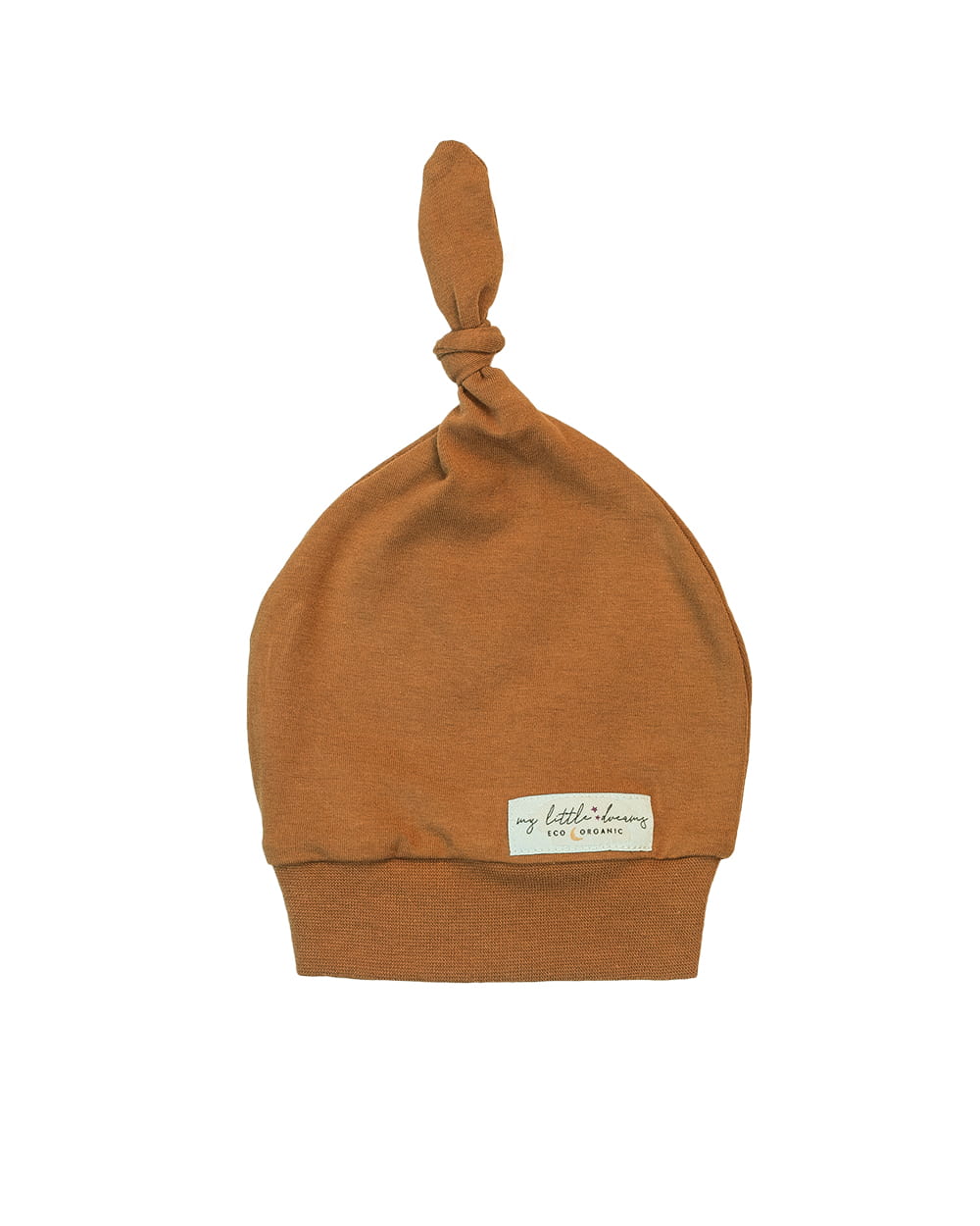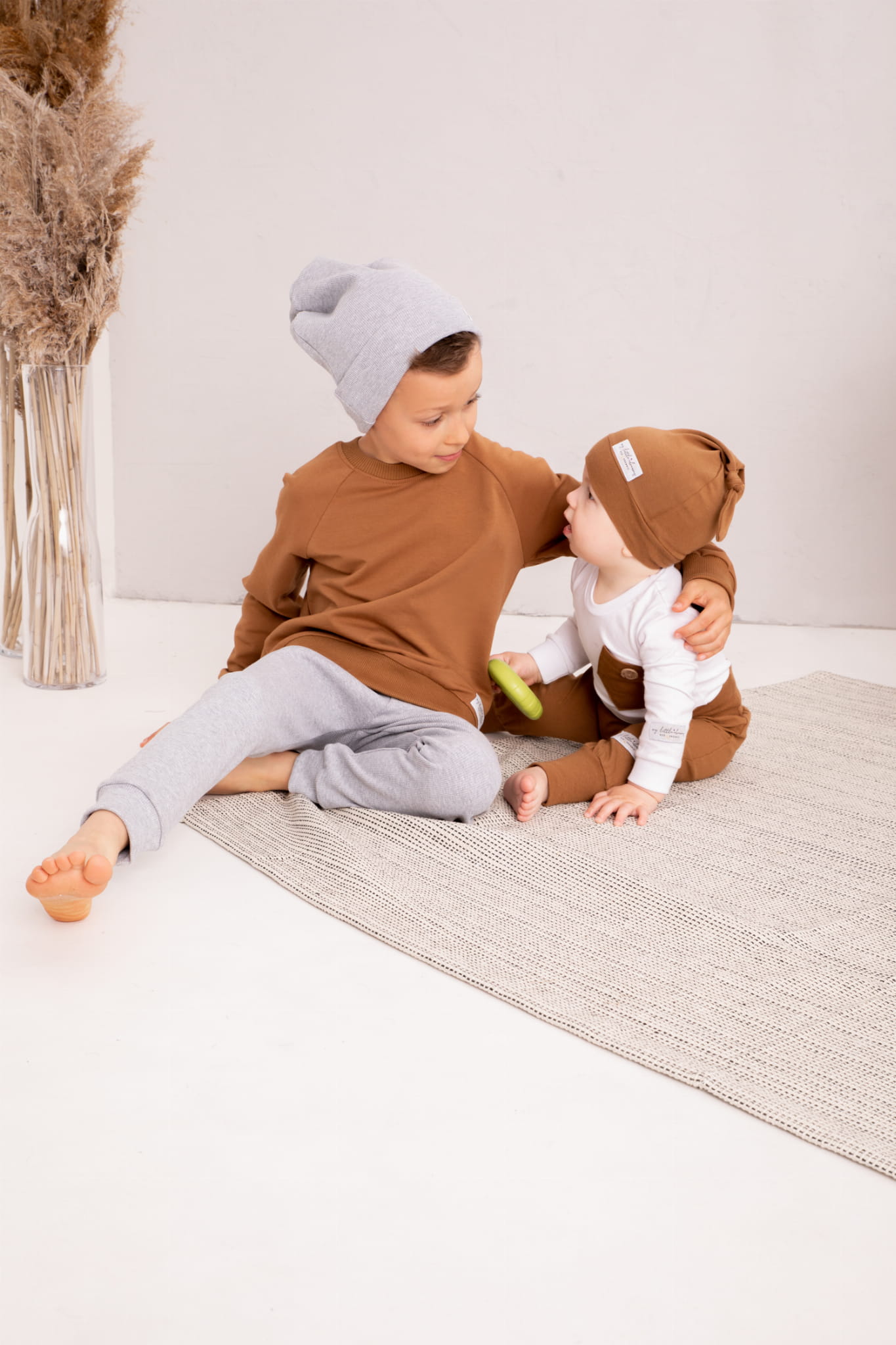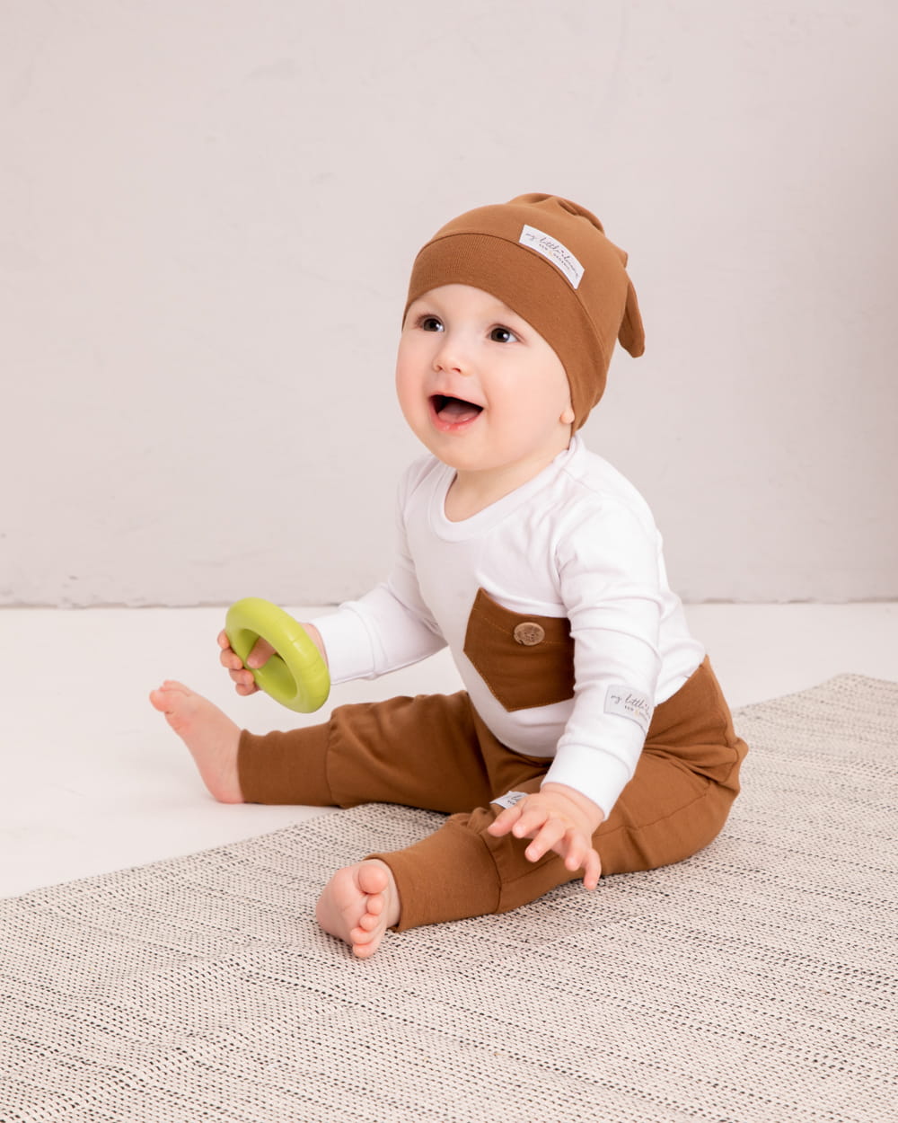 Komplet organic karmel i biel - body, półśpiochy bezuciskowe i czapka