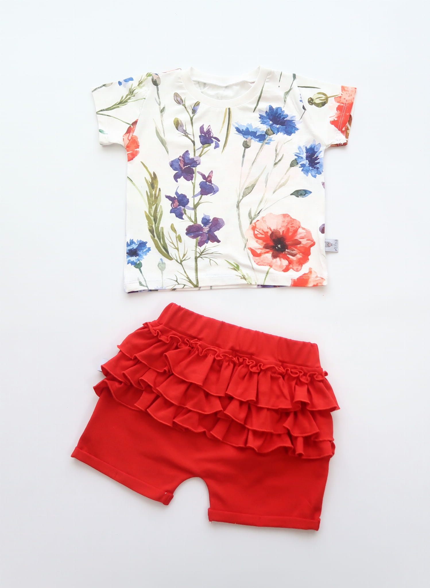 Komplet polne kwiaty i czerwień - koszulka i spodenki z falbankami