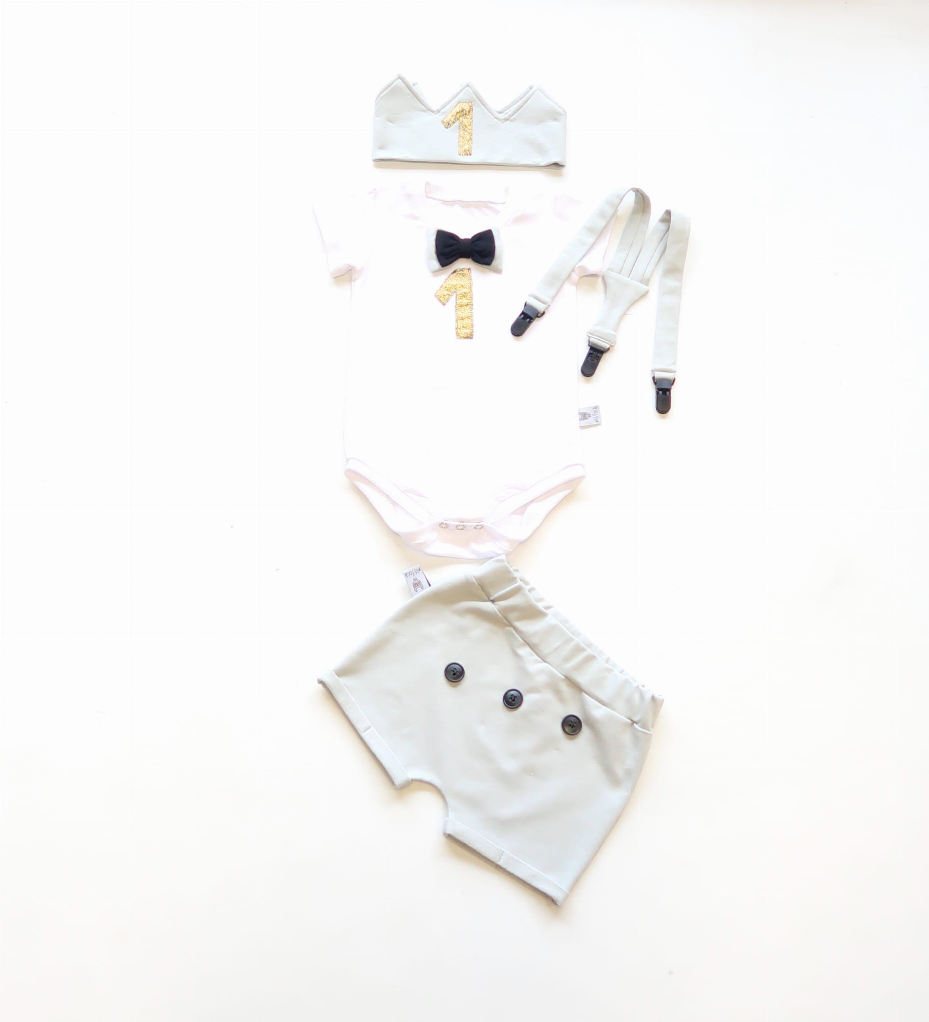 Komplet popiel na roczek - body, spodenki, szelki i korona