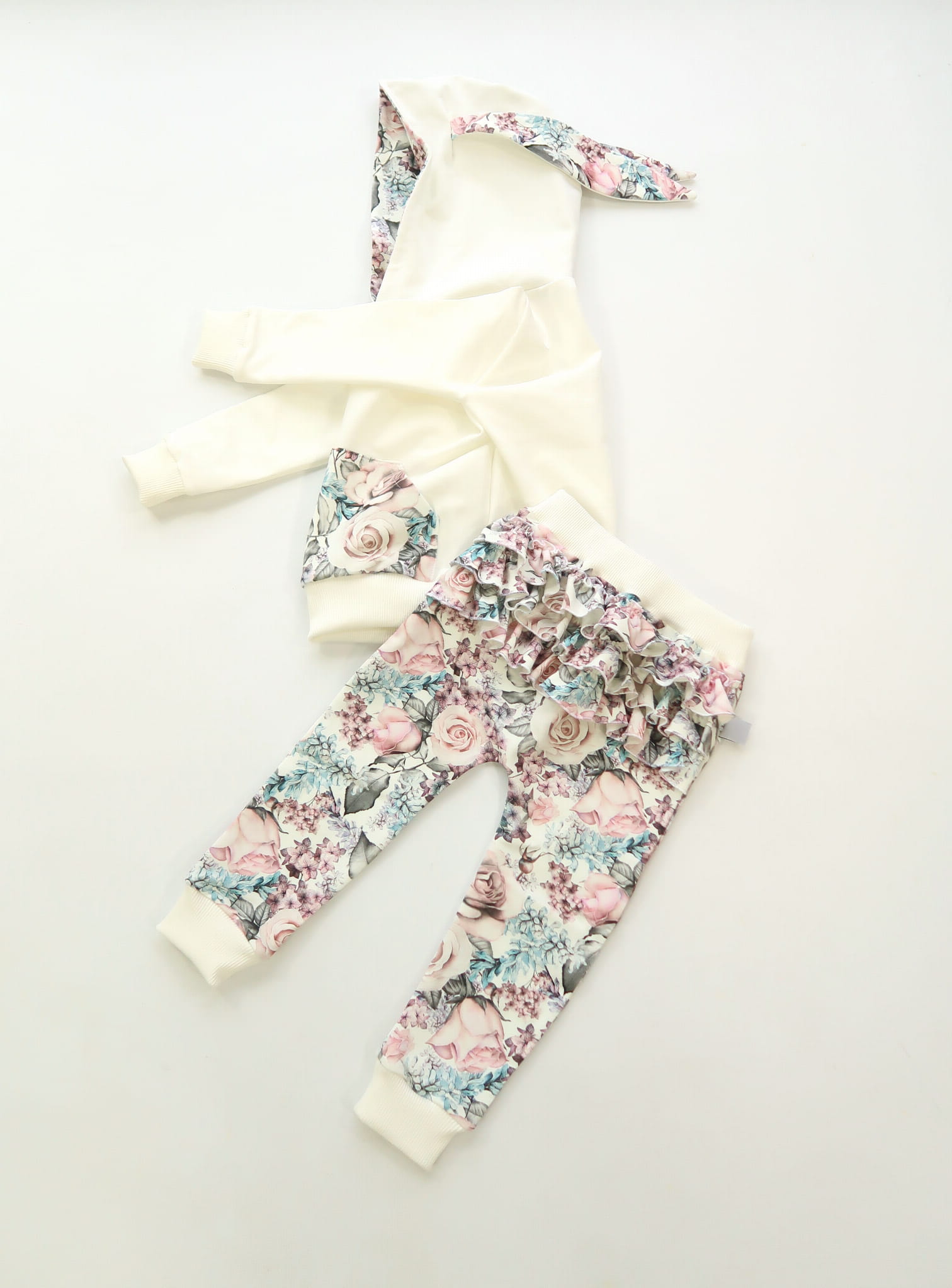 Komplet romantyczne róże i ecru - bluza króliczek i legginsy z falbankami