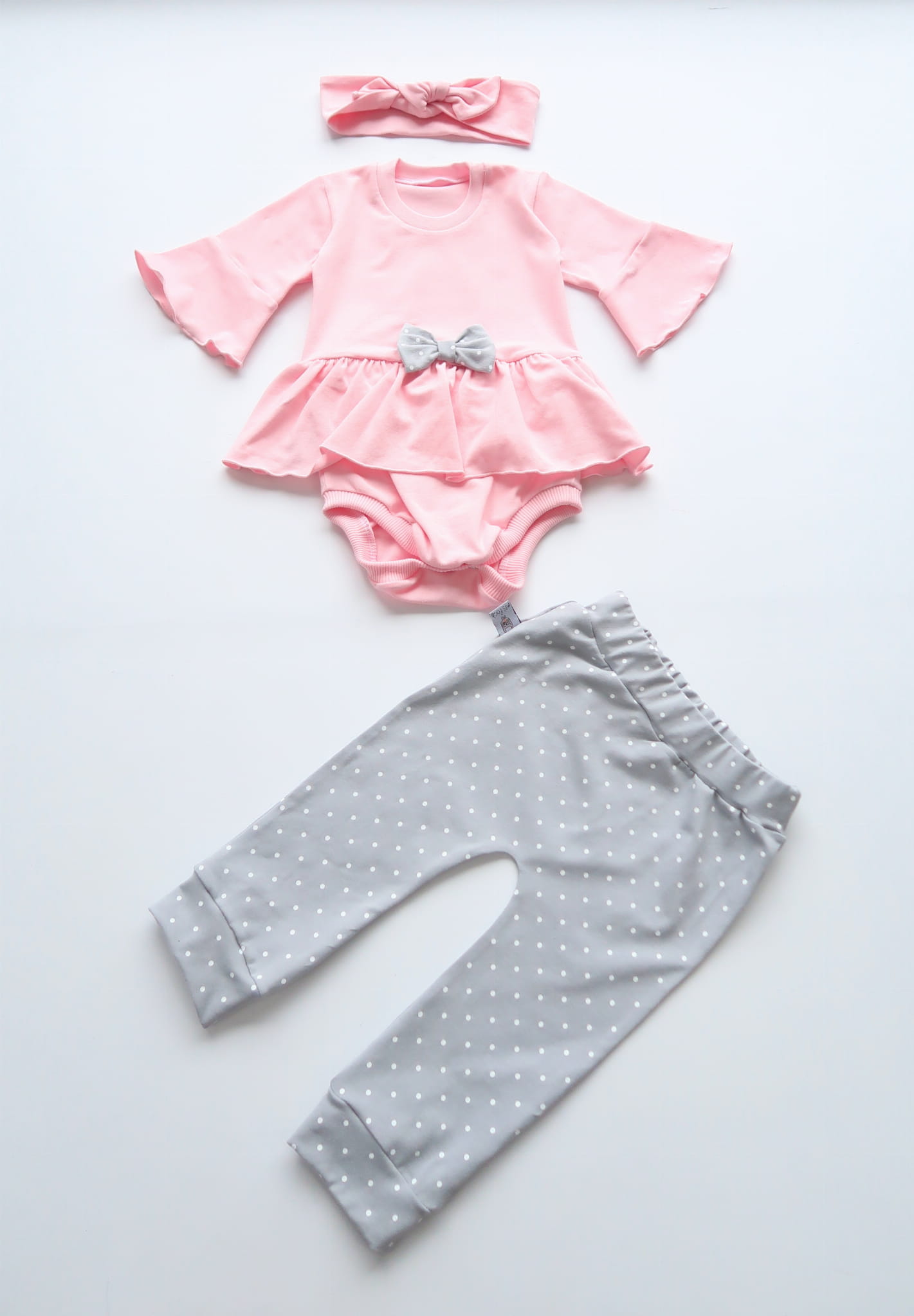 Komplet róż i groszki na szarym - body ze spódniczką, legginsy i opaska