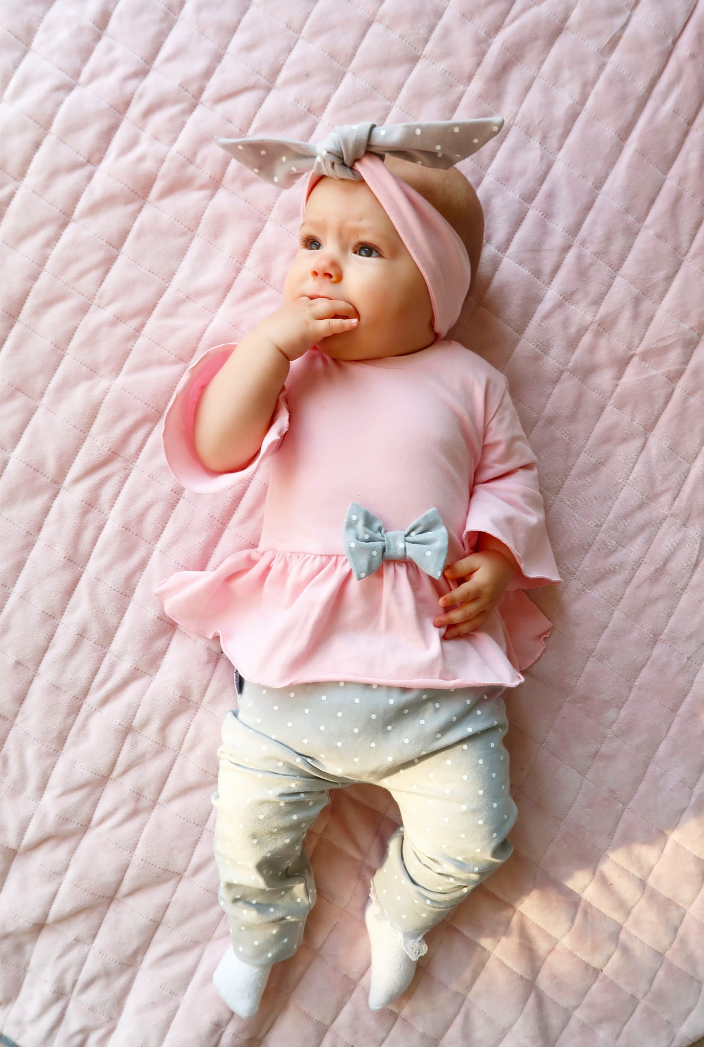 Komplet róż kwarcowy i groszki - bluza, legginsy i opaska
