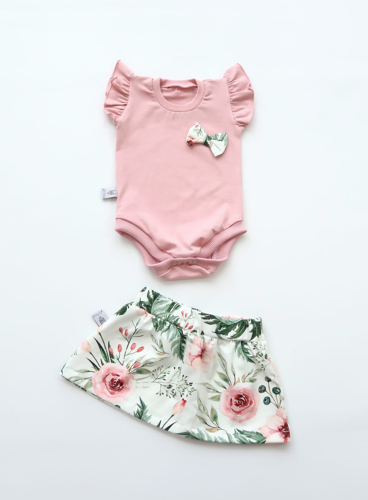 Komplet kwiaty w ogrodzie i róż kwarcowy - body i spódniczka