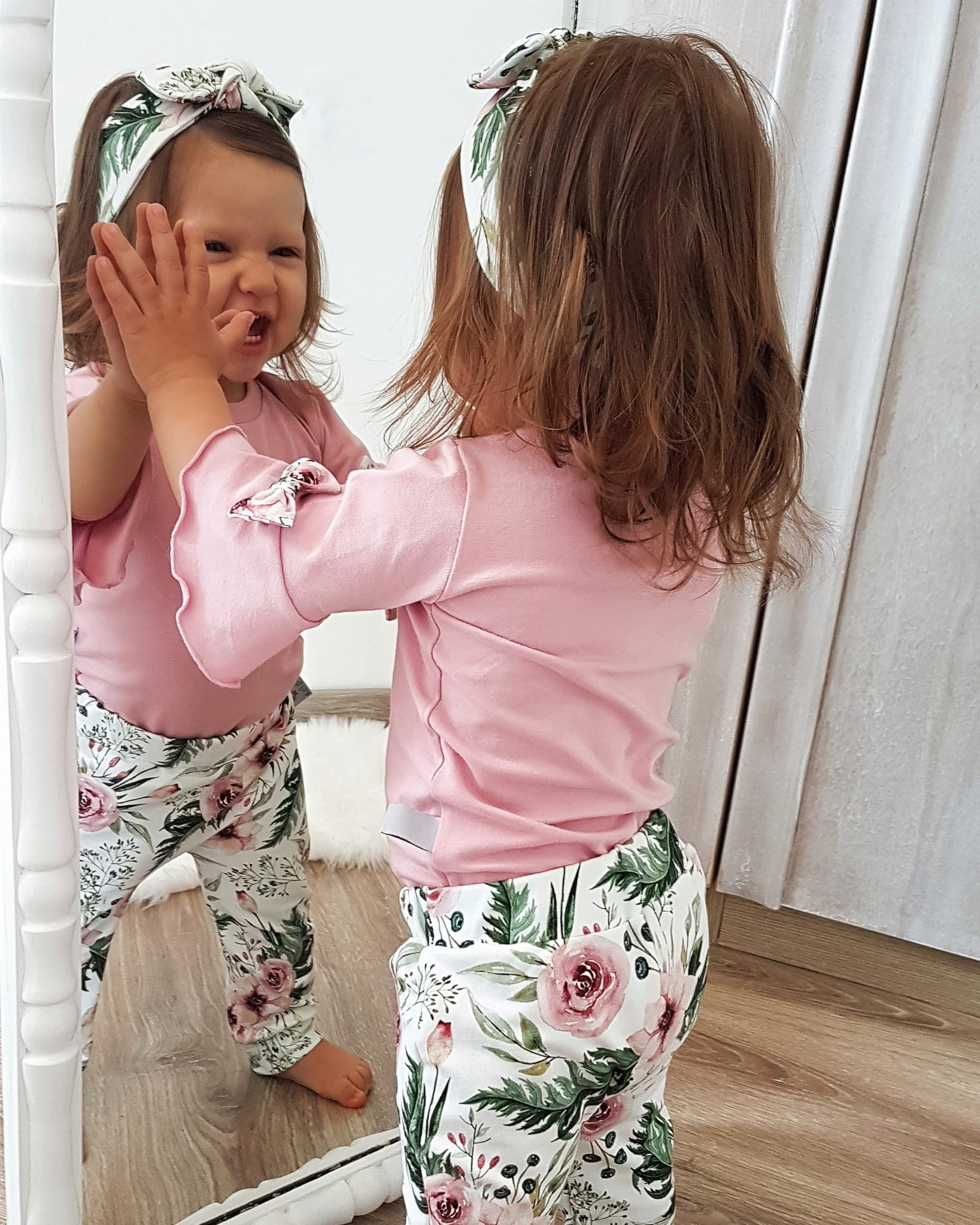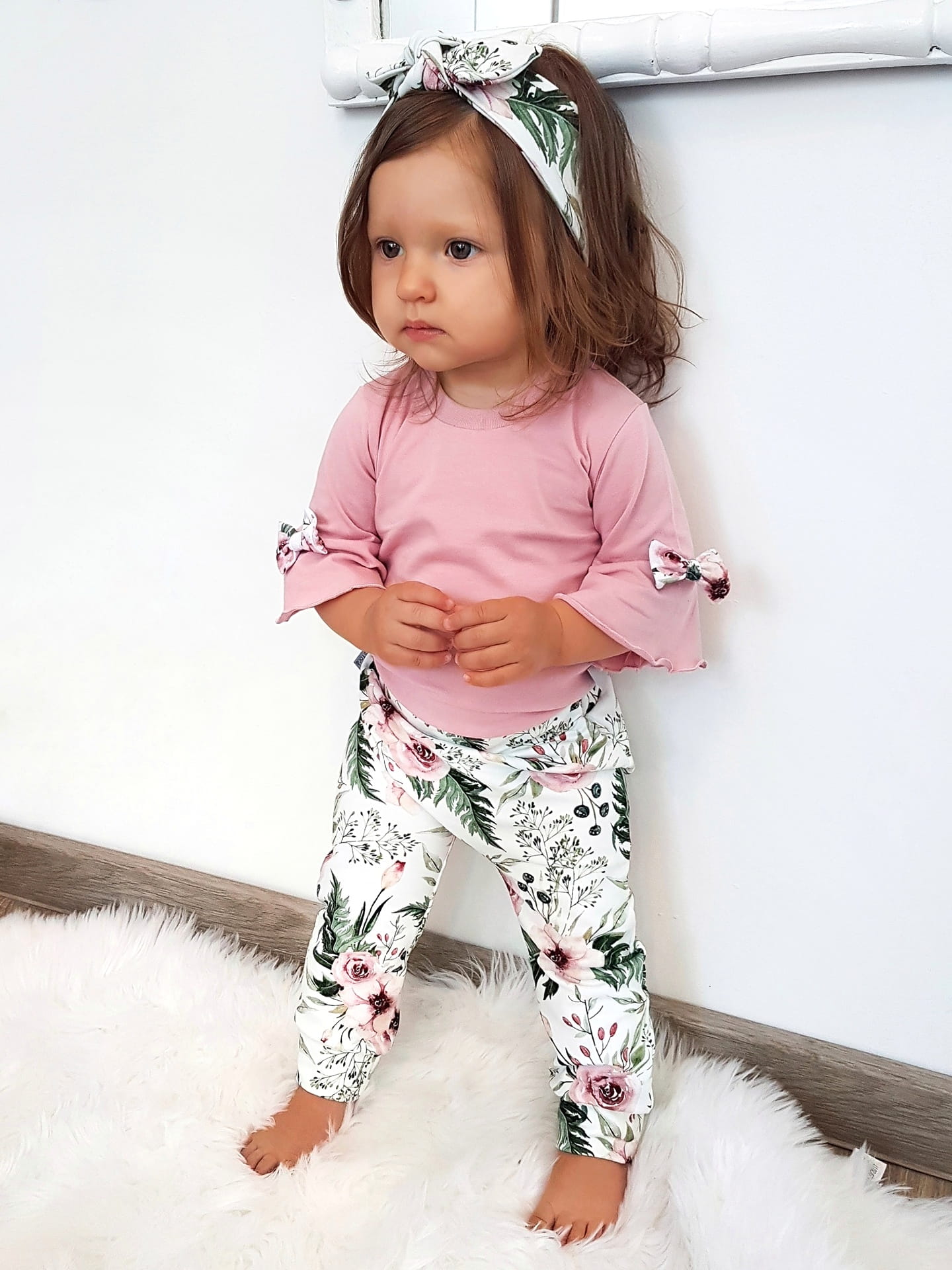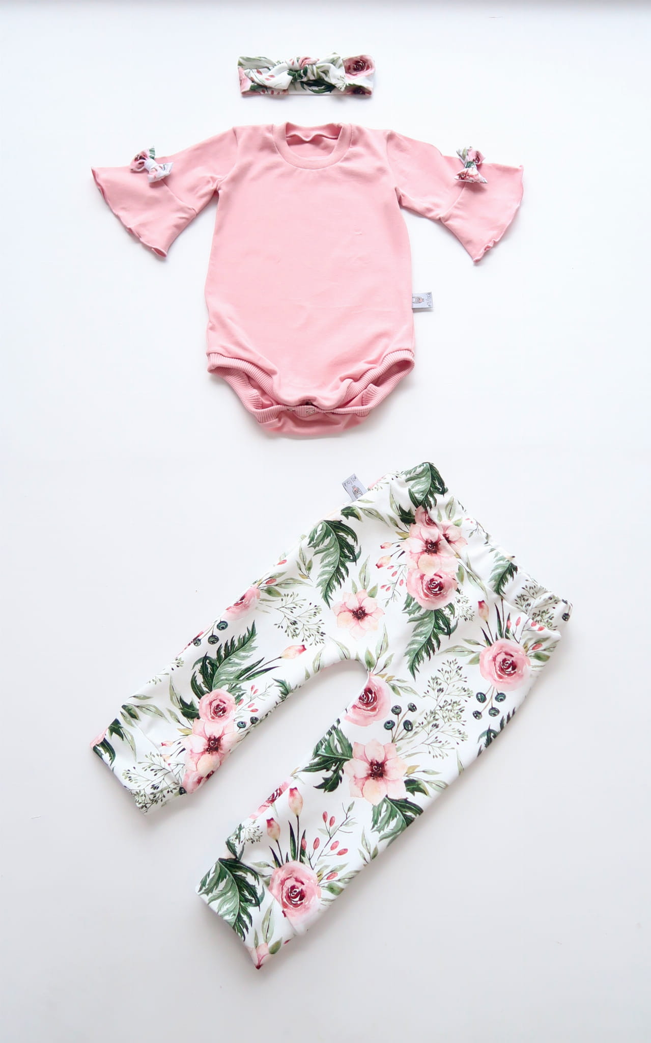 Komplet kwiaty w ogrodzie i róż kwarcowy - body, legginsy i opaska