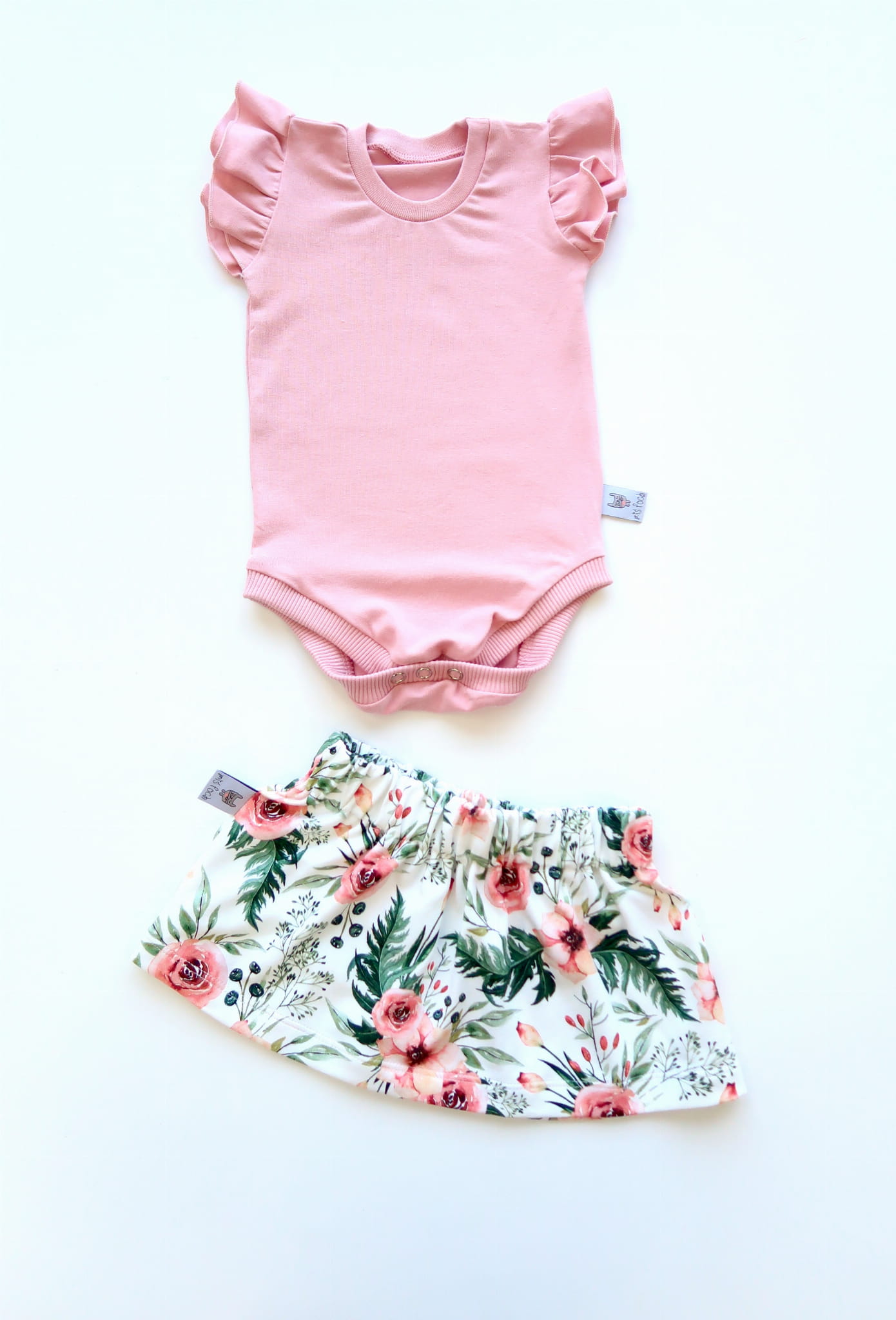 Komplet kwiaty w ogrodzie i róż kwarcowy - body i spódniczka