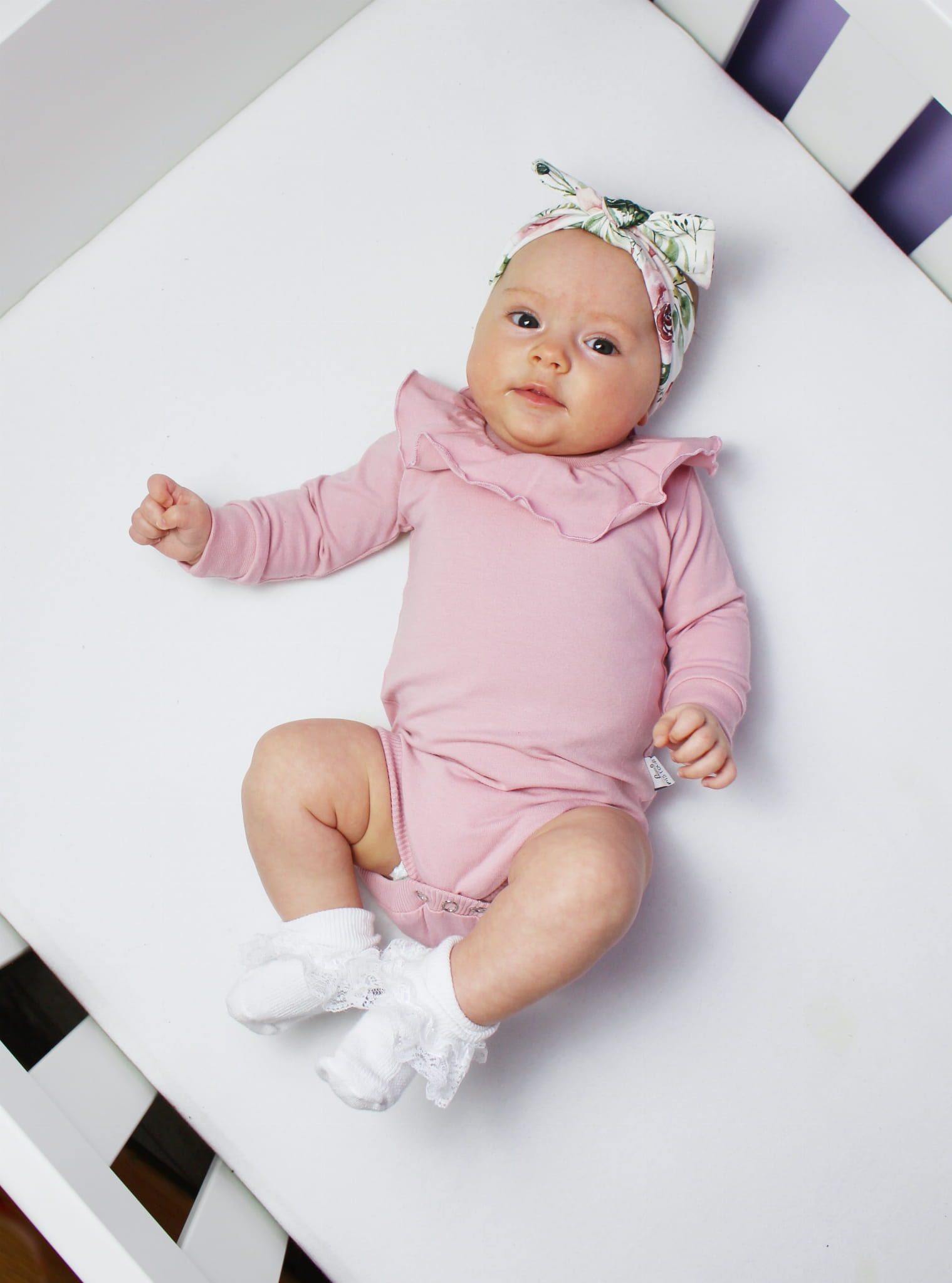 Komplet róż kwarcowy i kwiaty w ogrodzie z falbanką - body+legginsy+opaska