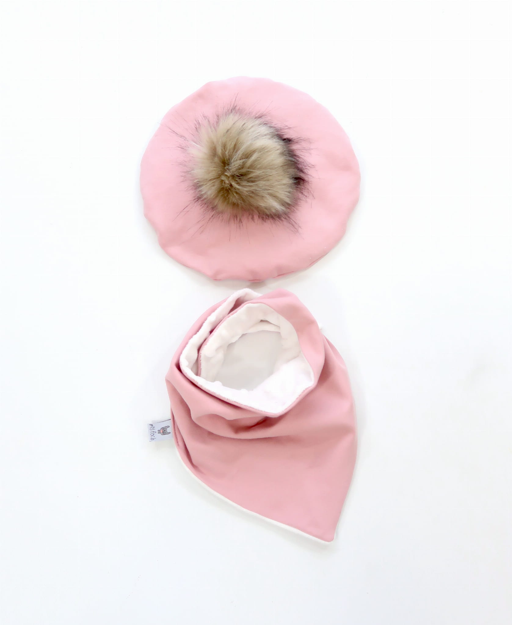 Komplet róż kwarcowy z beżowym pomponem - berecik i chusta