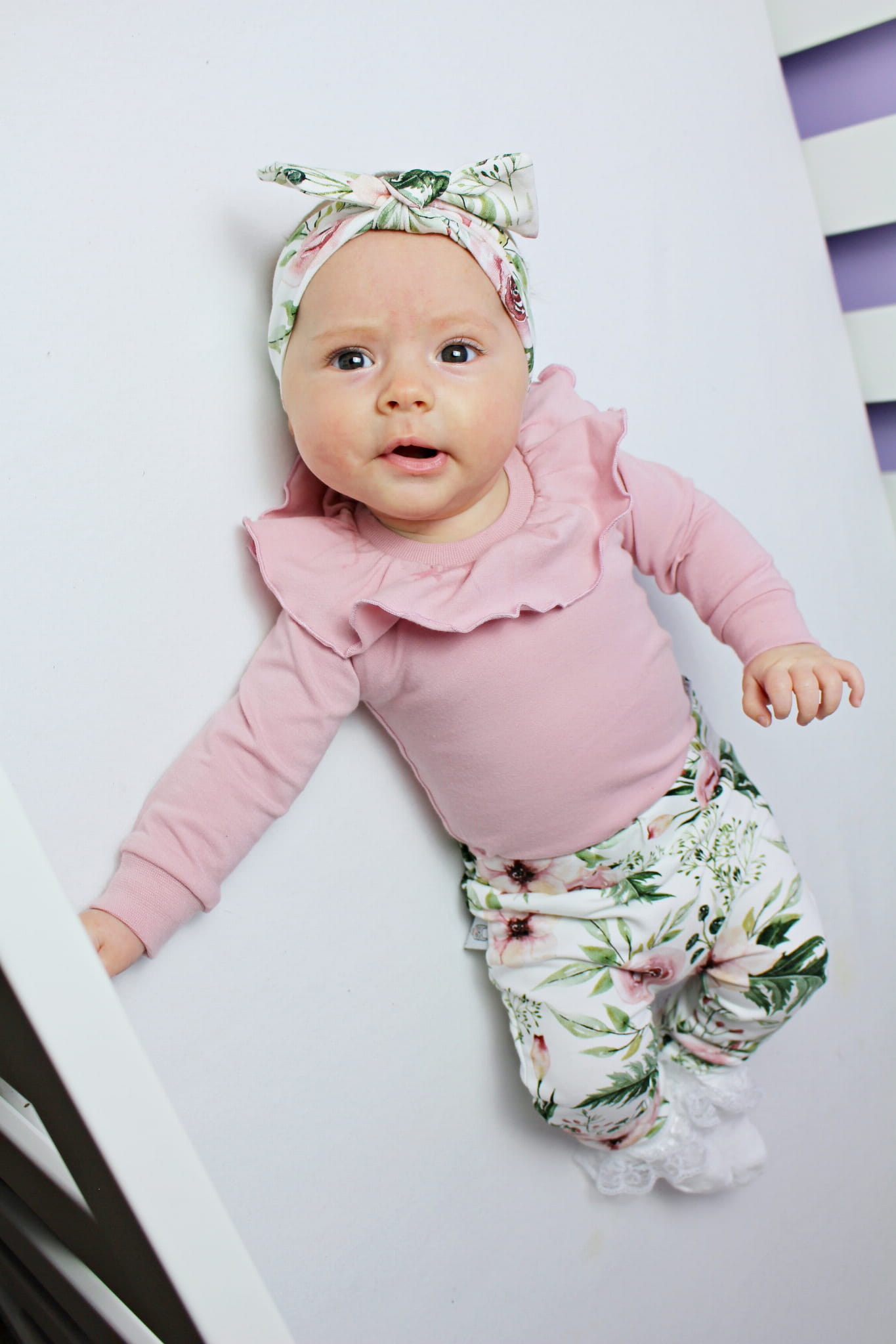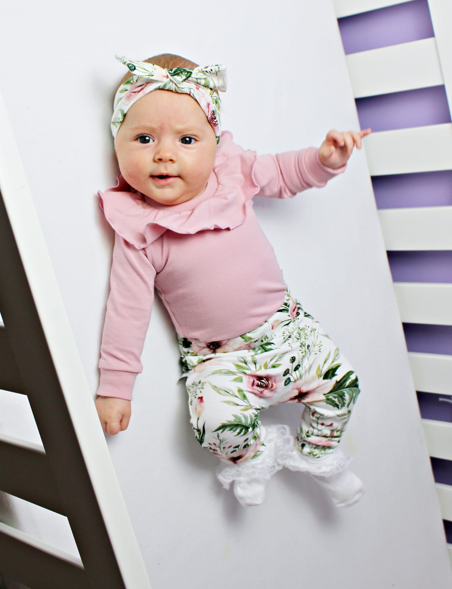 Komplet róż kwarcowy i kwiaty w ogrodzie z falbanką - body+legginsy+opaska