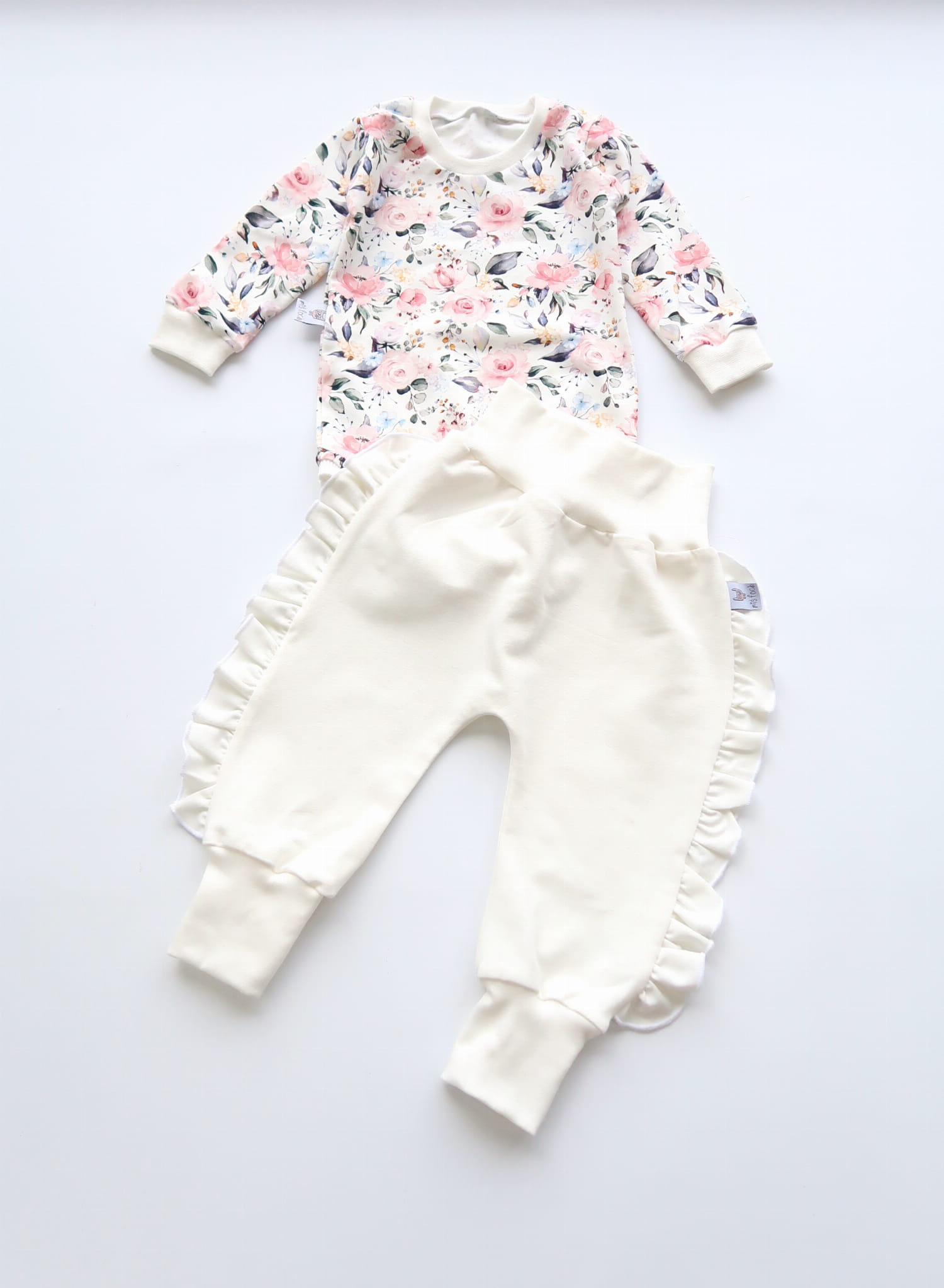 Komplet różany ogród i ecru - bezuciskowe baggy z falbanką i body