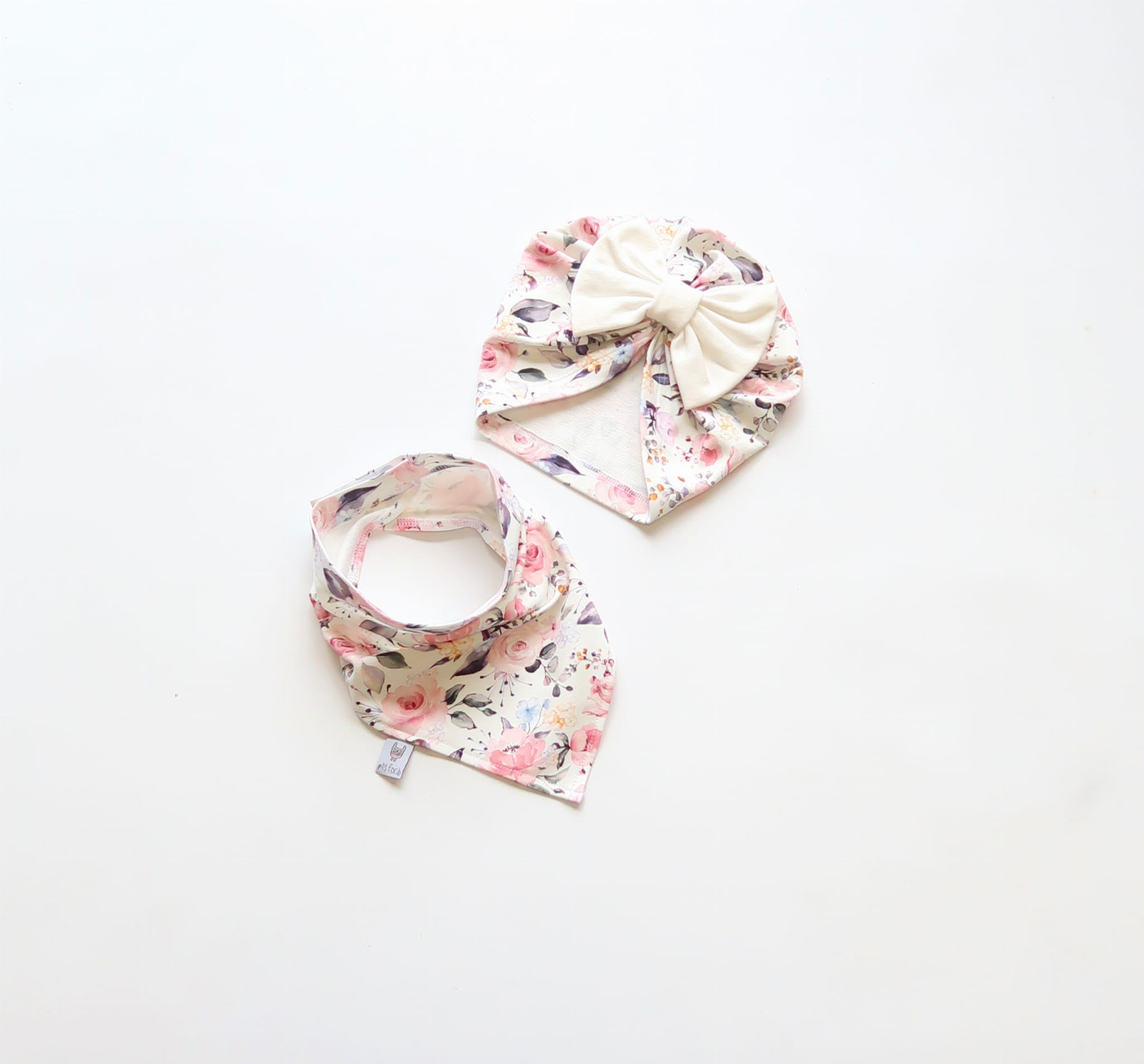 Cudowny, jednowarstwowy komplet wiosenno - jesienny dla Maluszka. Komplet - turban i chusta, wykonany jest z najwyższej jakości materiałów - mięciutki i milutki.