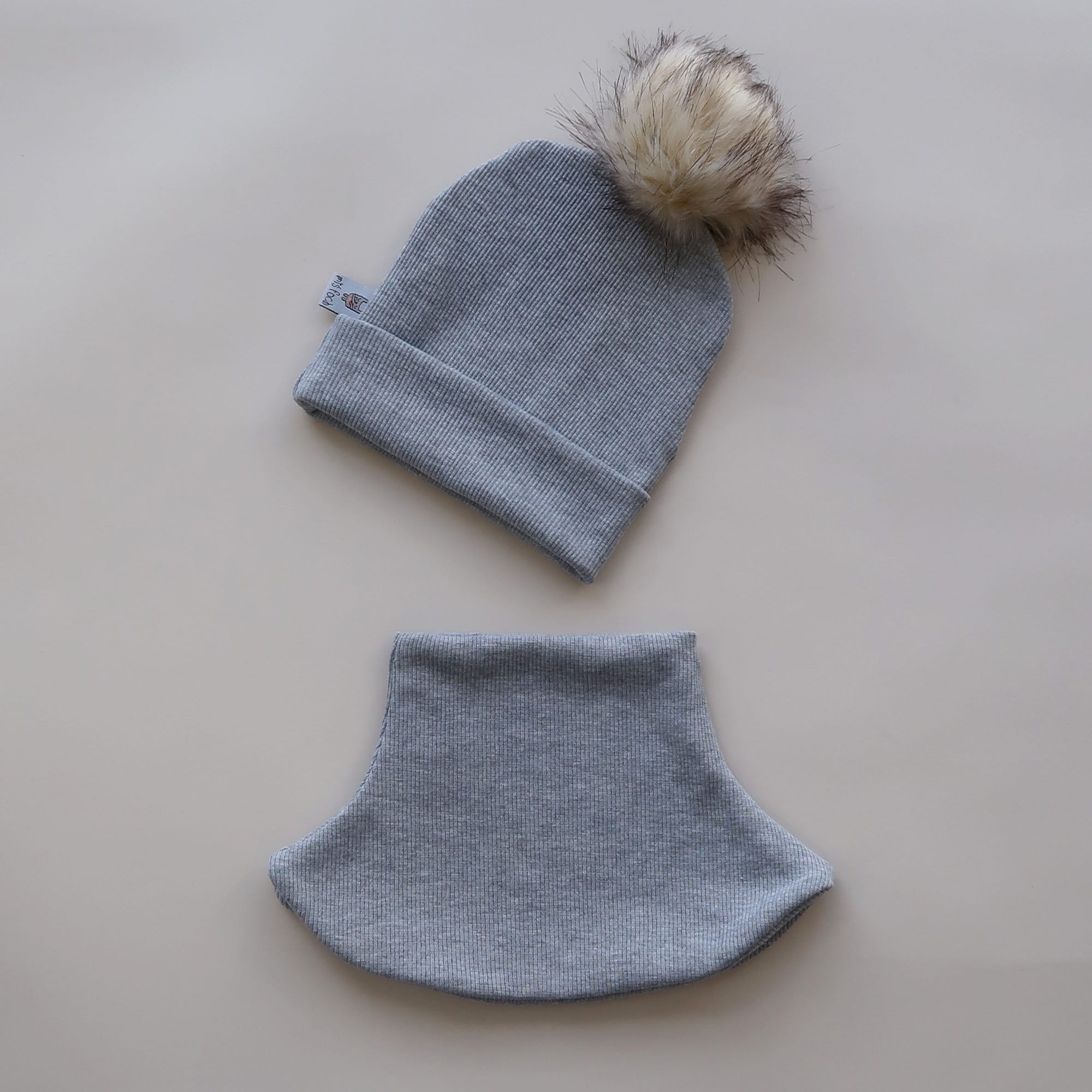Komplet szare prążki i pompon beżowy - czapka i komin
