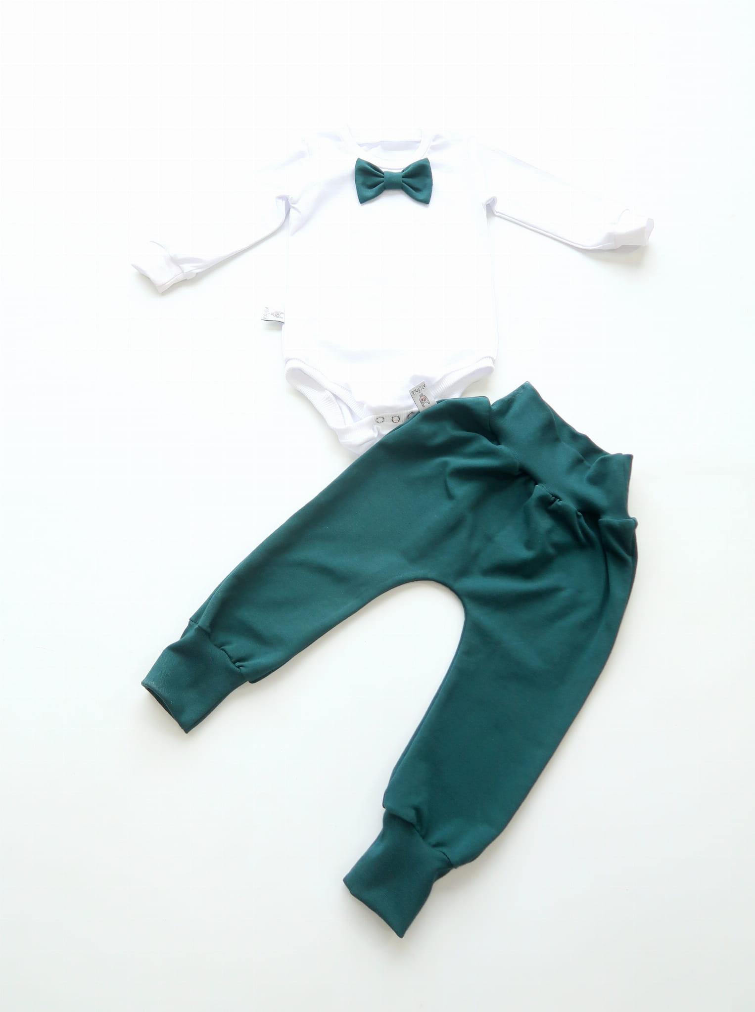 Komplet zieleń butelkowa z guziczkami - bezuciskowe baggy i body z muchą