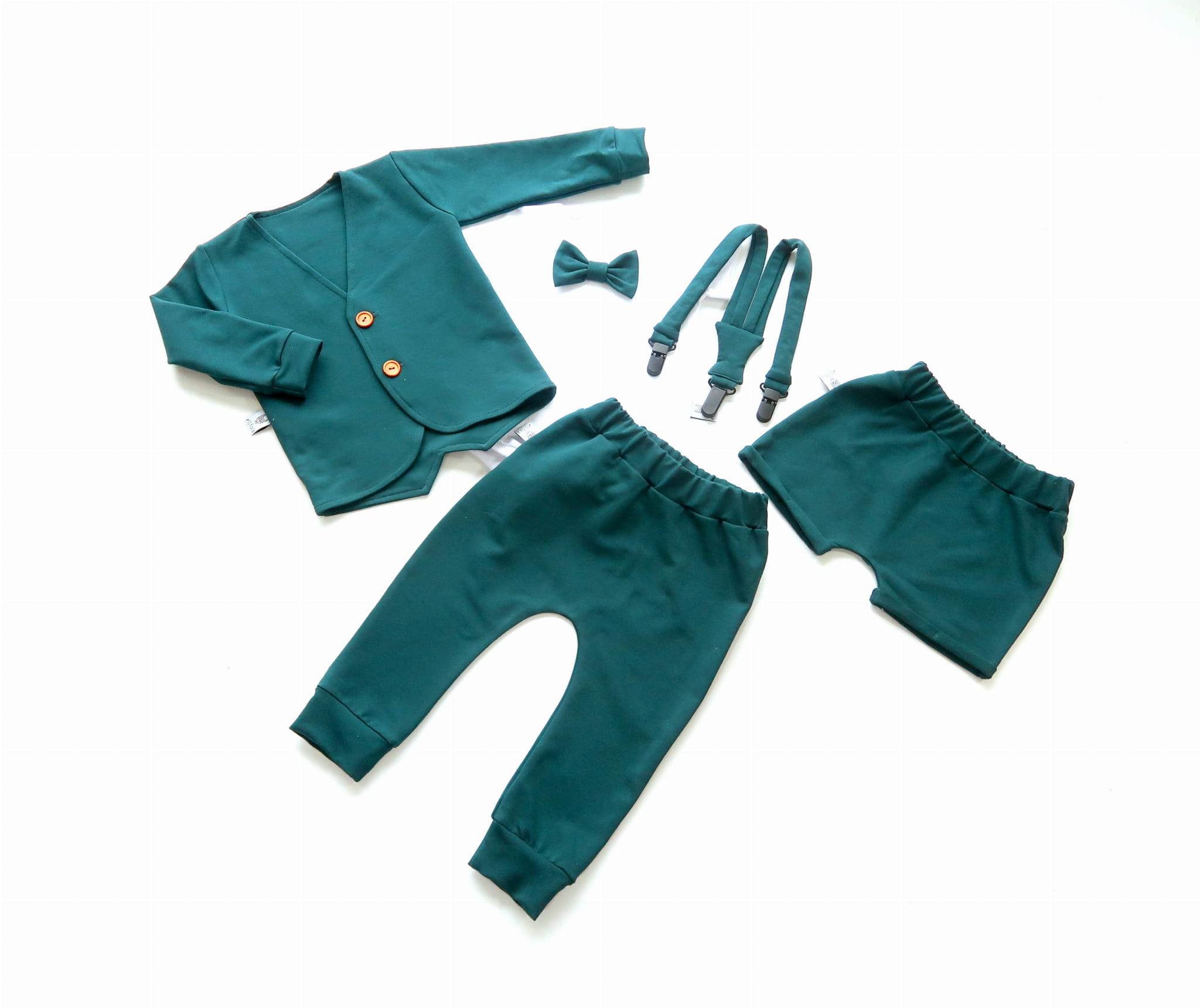 Komplet zieleń butelkowa z guziczkami - frak, body, baggy, spodenki i szelki