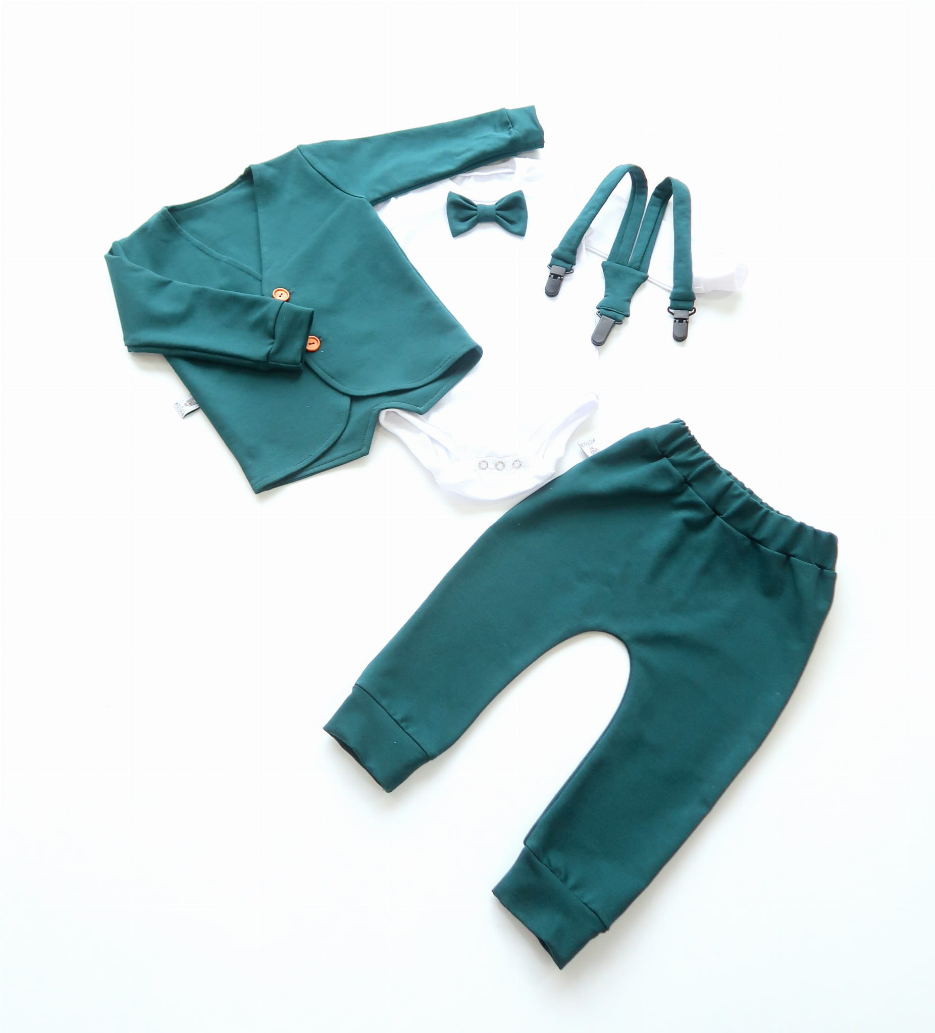 Komplet zieleń butelkowa - frak, body długi rękaw, baggy i szelki