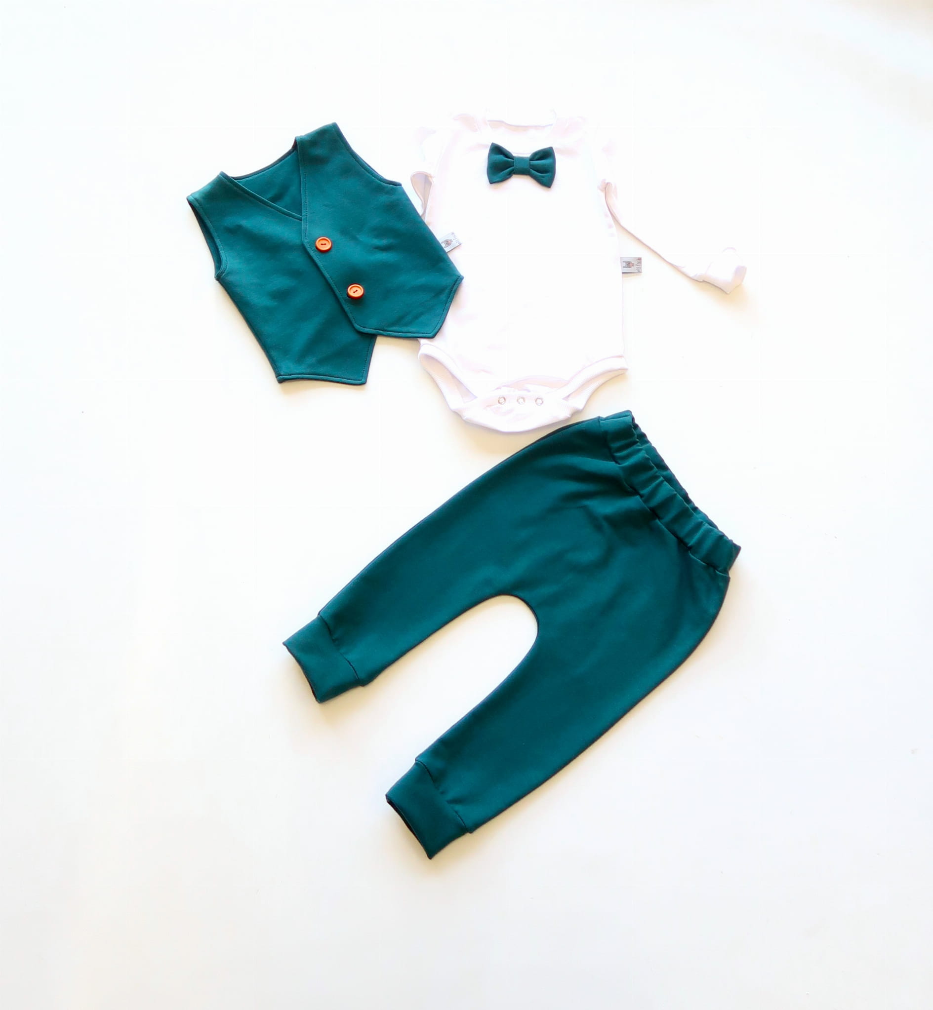 Komplet zieleń butelkowa - kamizelka, body i baggy