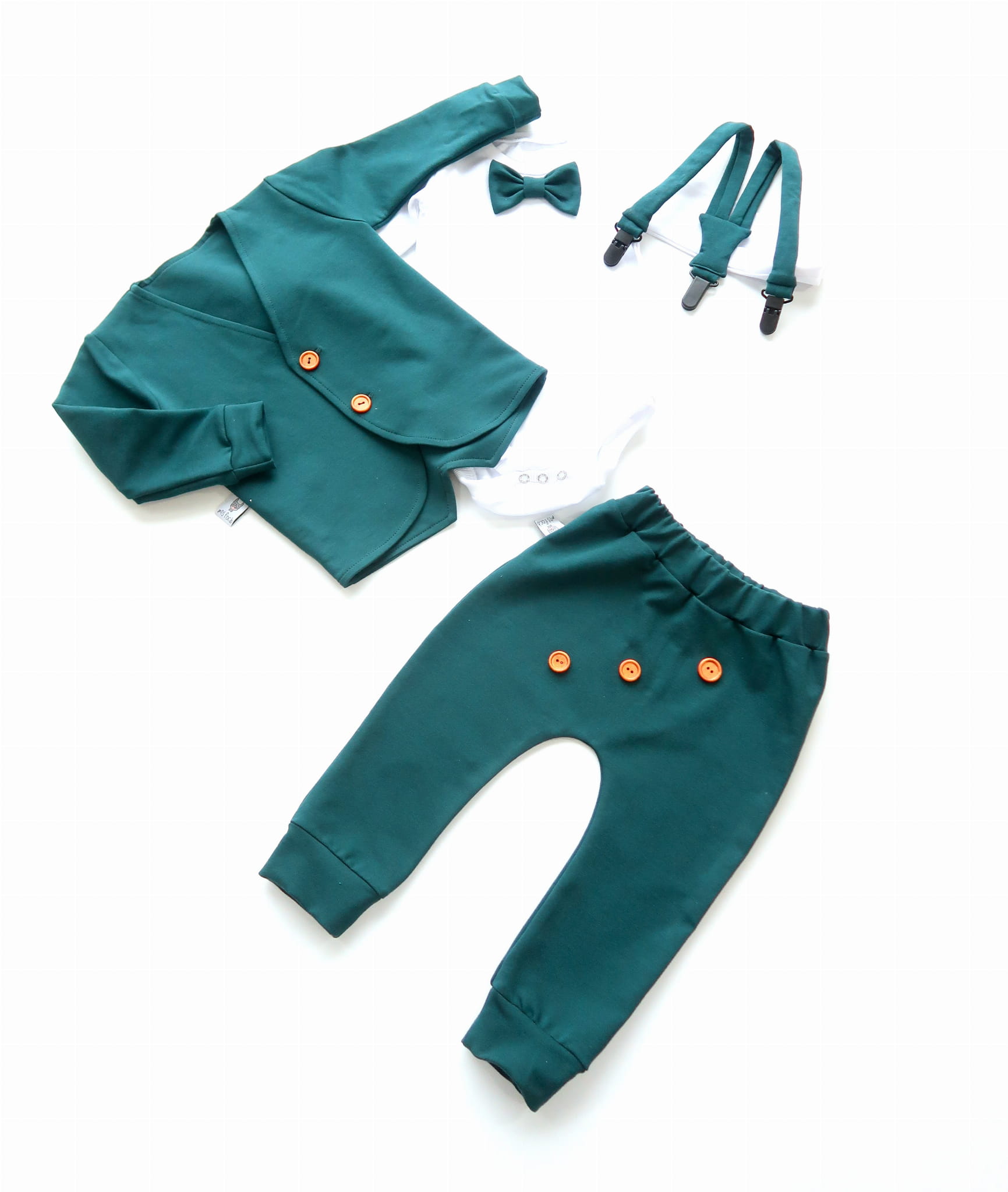Komplet zieleń butelkowa z guziczkami - frak, body, baggy, spodenki i szelki